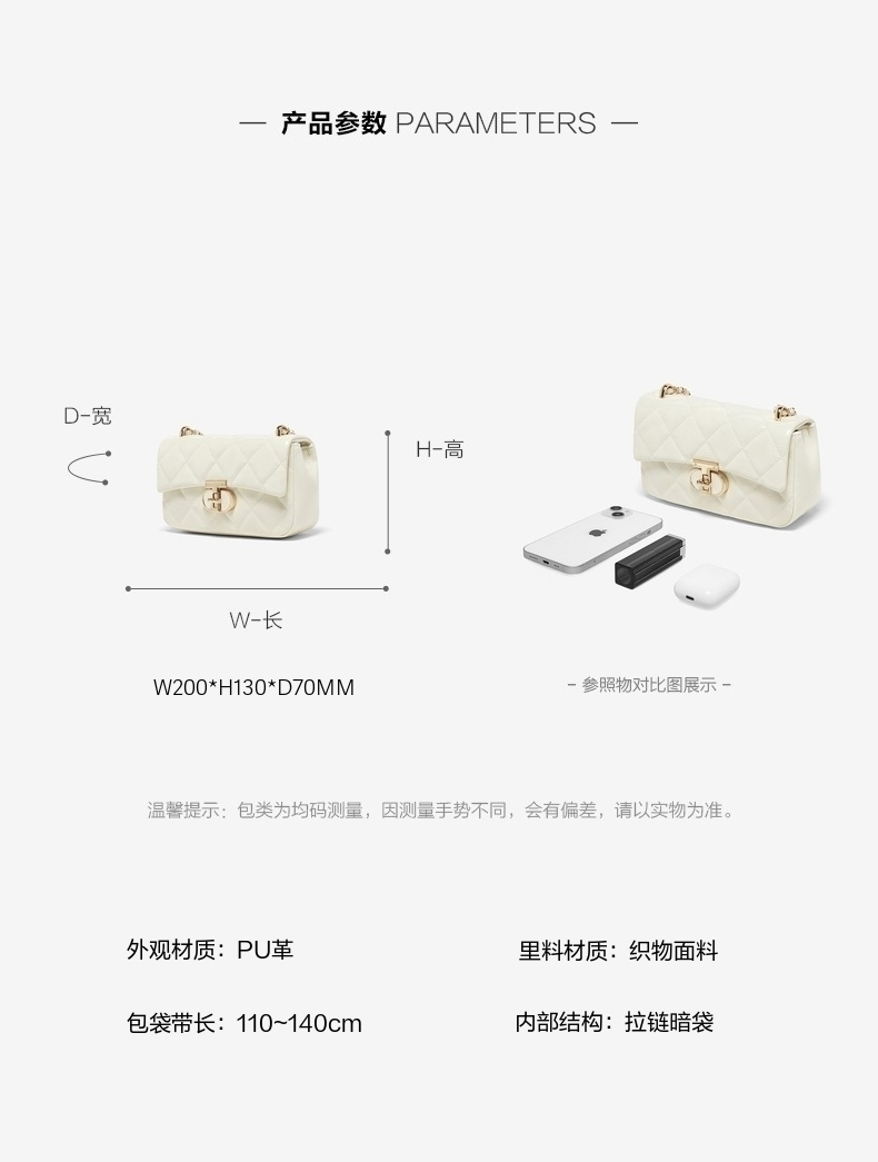 | 包的规格:W200*H130*D70MM | 内部结构:拉链暗袋 | 背带方式:单肩/斜挎 | 风格:OL通勤 | 色系:白色 |