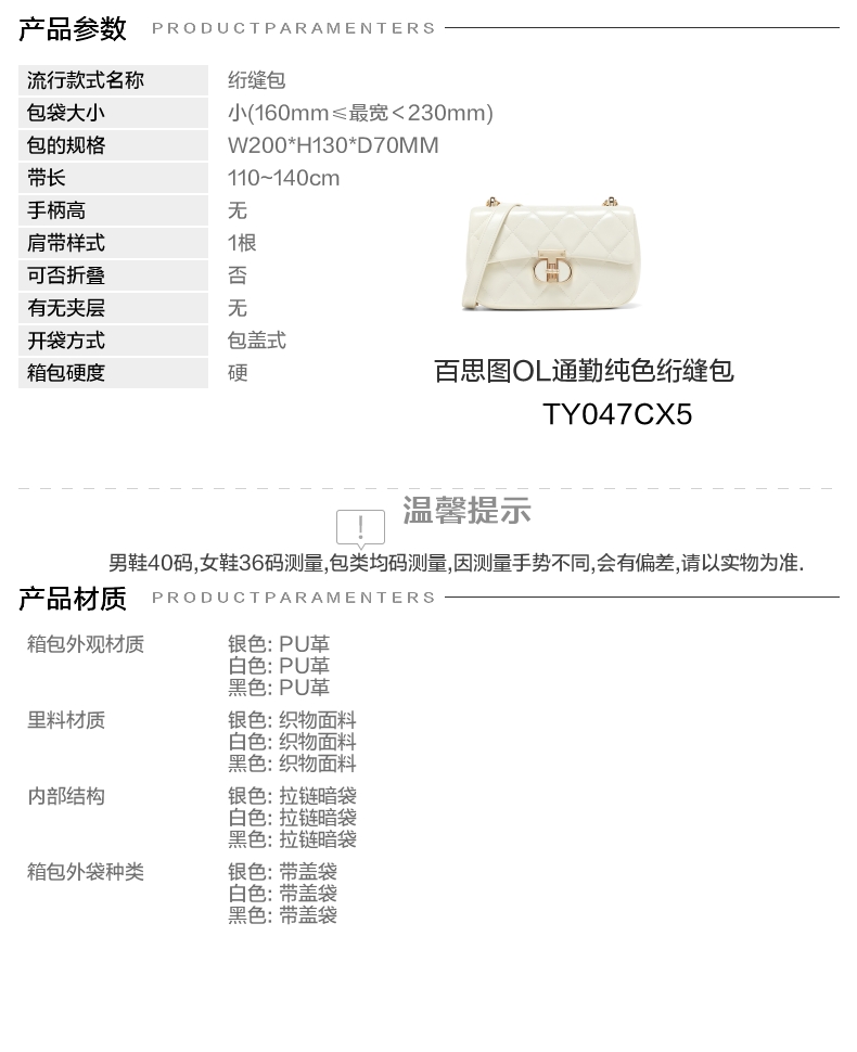 | 适用场景:通勤 | 开袋方式:包盖式 | 性别:女子 | 手柄高:无 | 里料材质:织物面料 |