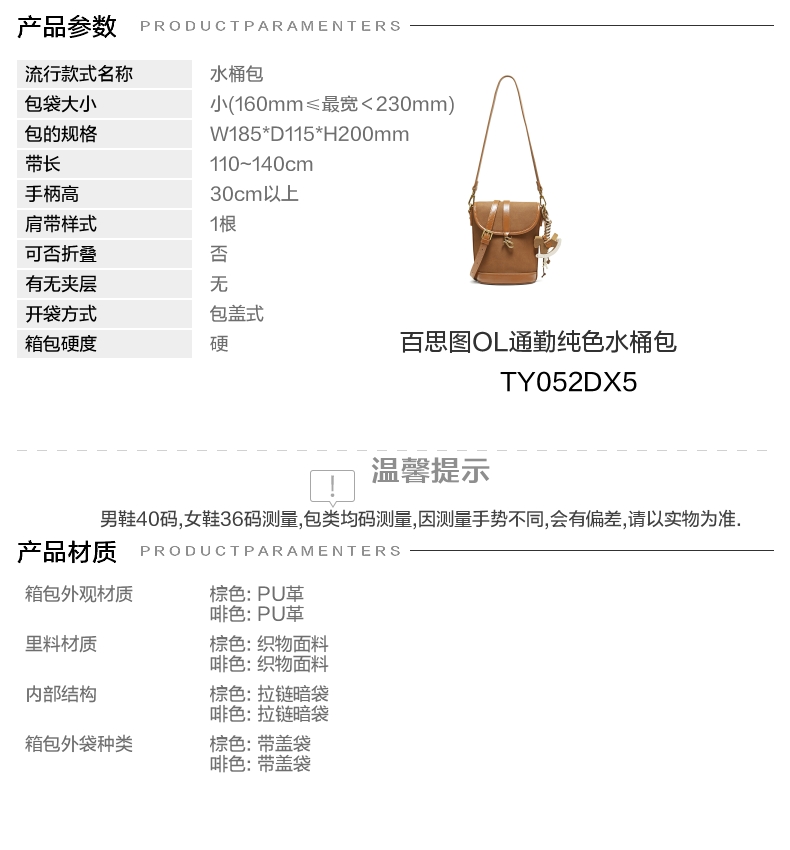 | 包的规格:W185*D115*H200mm | 内部结构:拉链暗袋 | 背带方式:单肩/斜挎 | 风格:OL通勤 | 色系:棕色 |
