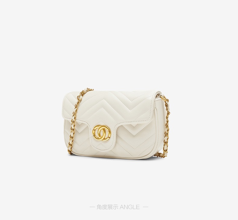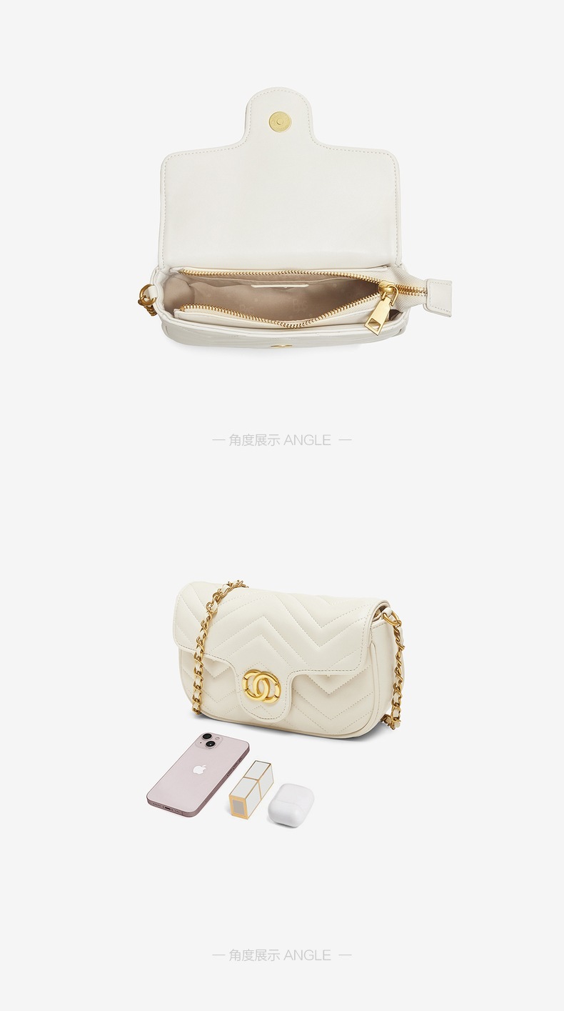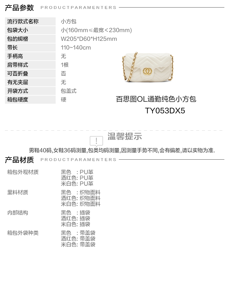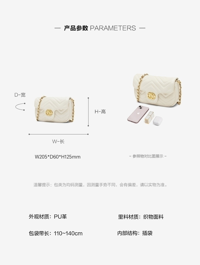 | 包的规格:W205*D60*H125mm | 内部结构:插袋 | 背带方式:单肩/斜挎 | 风格:OL通勤 | 色系:米白 |