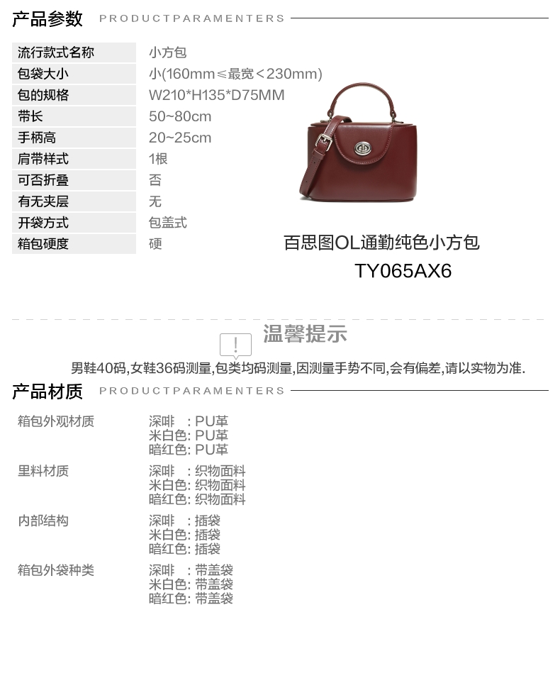 | 色系:红色 | 适用场景:通勤 | 开袋方式:包盖式 | 性别:女子 | 手柄高:20~25cm |