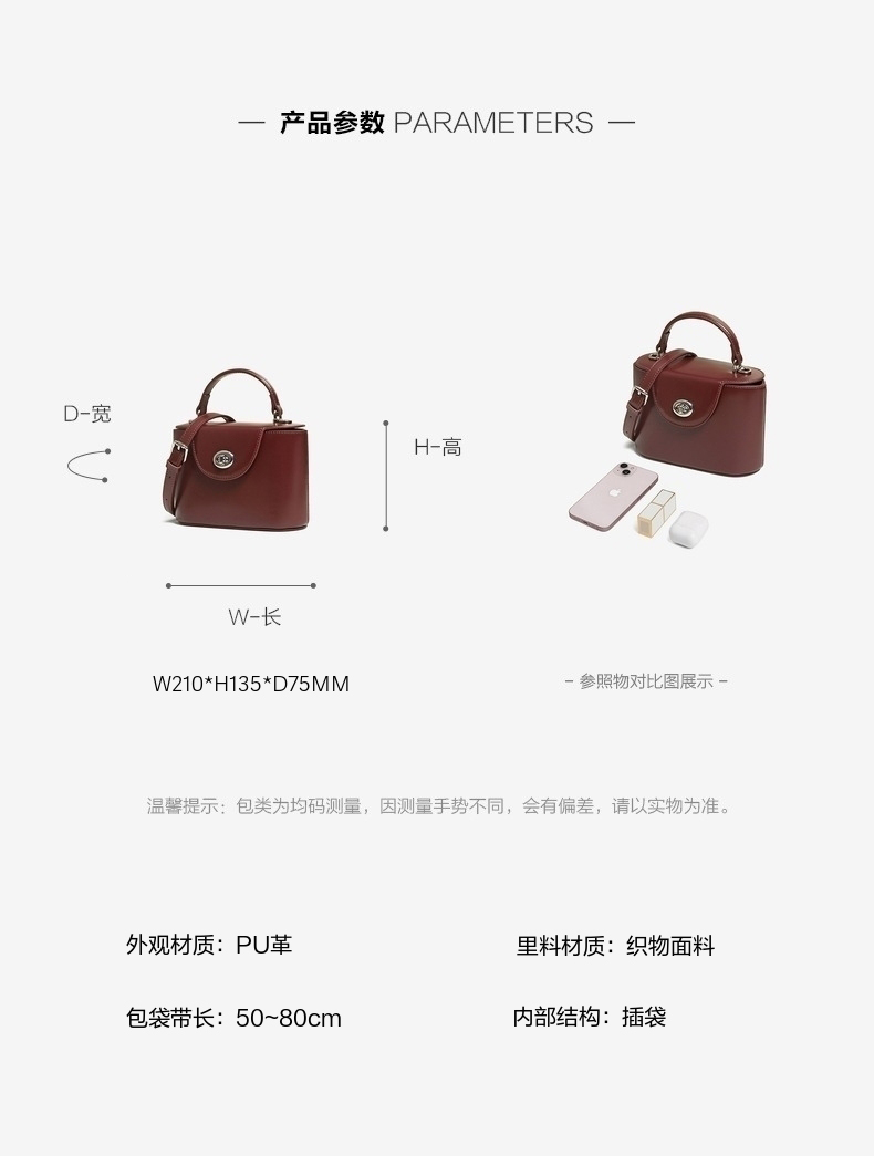 | 流行元素:纯色 | 包的规格:W210*H135*D75MM | 内部结构:插袋 | 背带方式:单肩/斜挎 | 风格:OL通勤 |