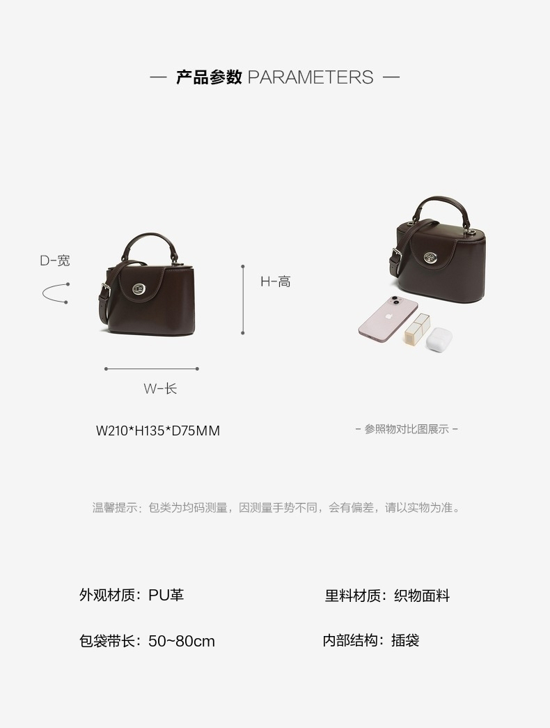 | 色系:咖啡色 | 适用场景:通勤 | 开袋方式:包盖式 | 性别:女子 | 手柄高:20~25cm |
