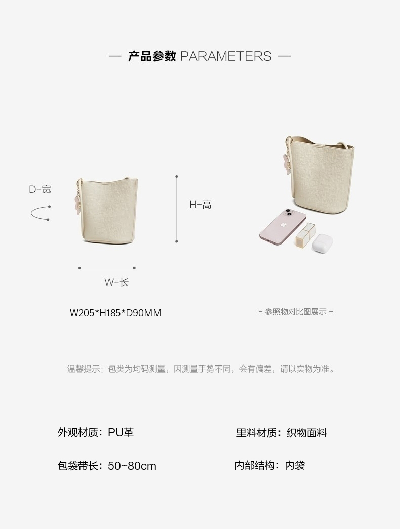 | 流行元素:纯色 | 包的规格:W205*H185*D90MM | 内部结构:内袋 | 背带方式:单肩/斜挎 | 风格:OL通勤 |