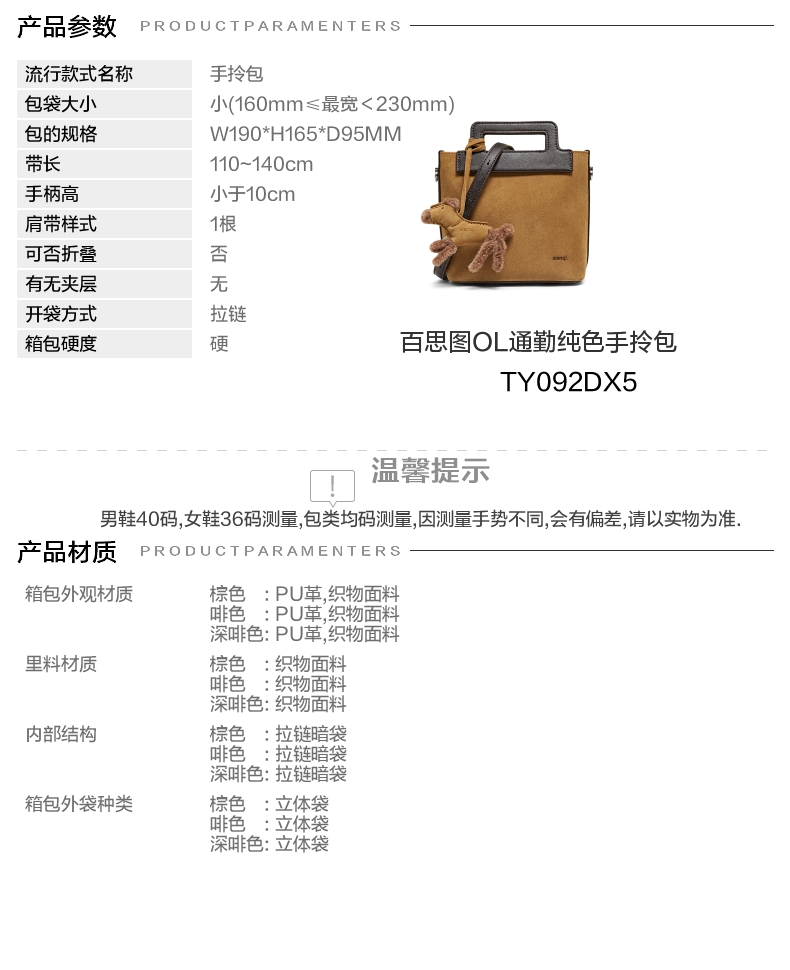 | 色系:棕色 | 适用场景:通勤 | 开袋方式:拉链 | 性别:女子 | 手柄高:小于10cm |