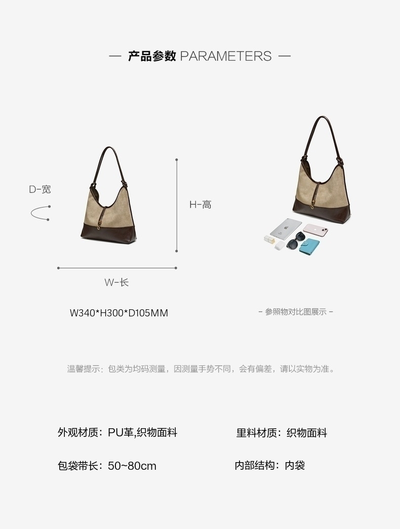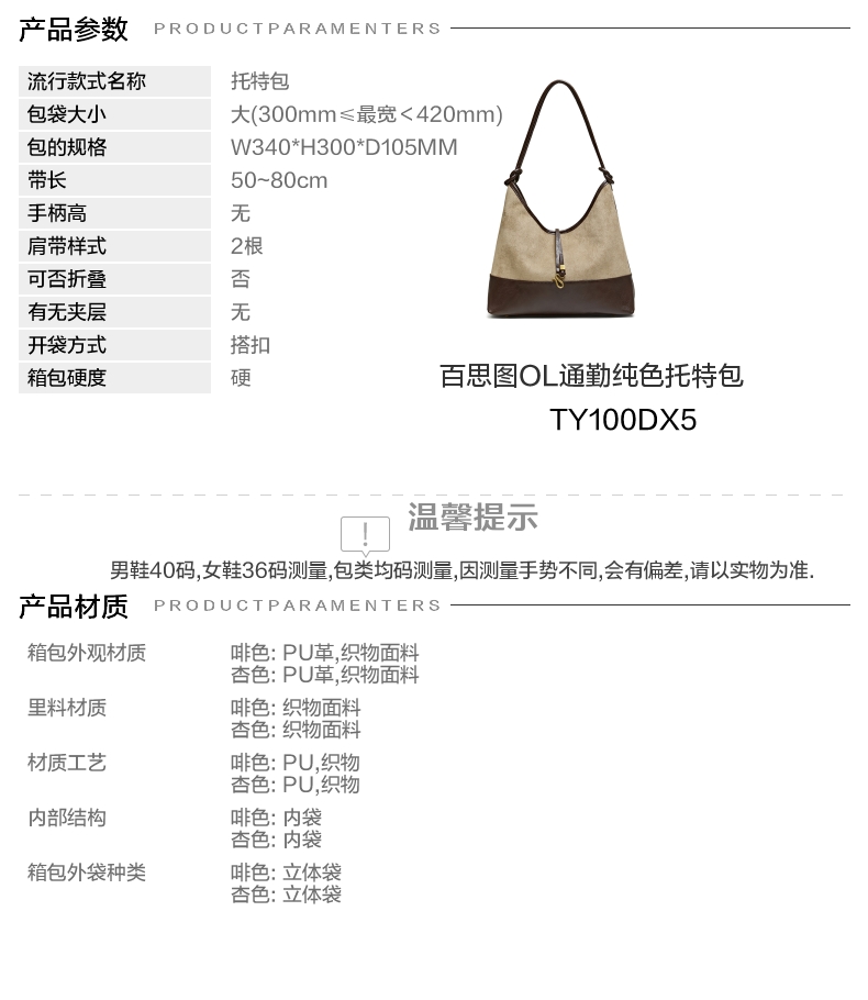 | 包的规格:W340*H300*D105MM | 内部结构:内袋 | 背带方式:单肩 | 风格:OL通勤 | 色系:杏色 |