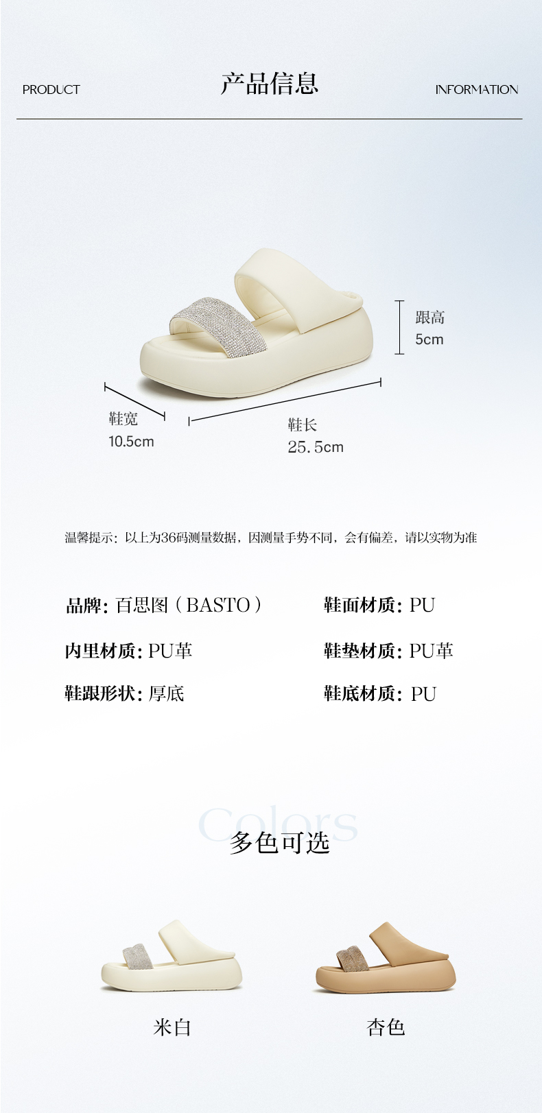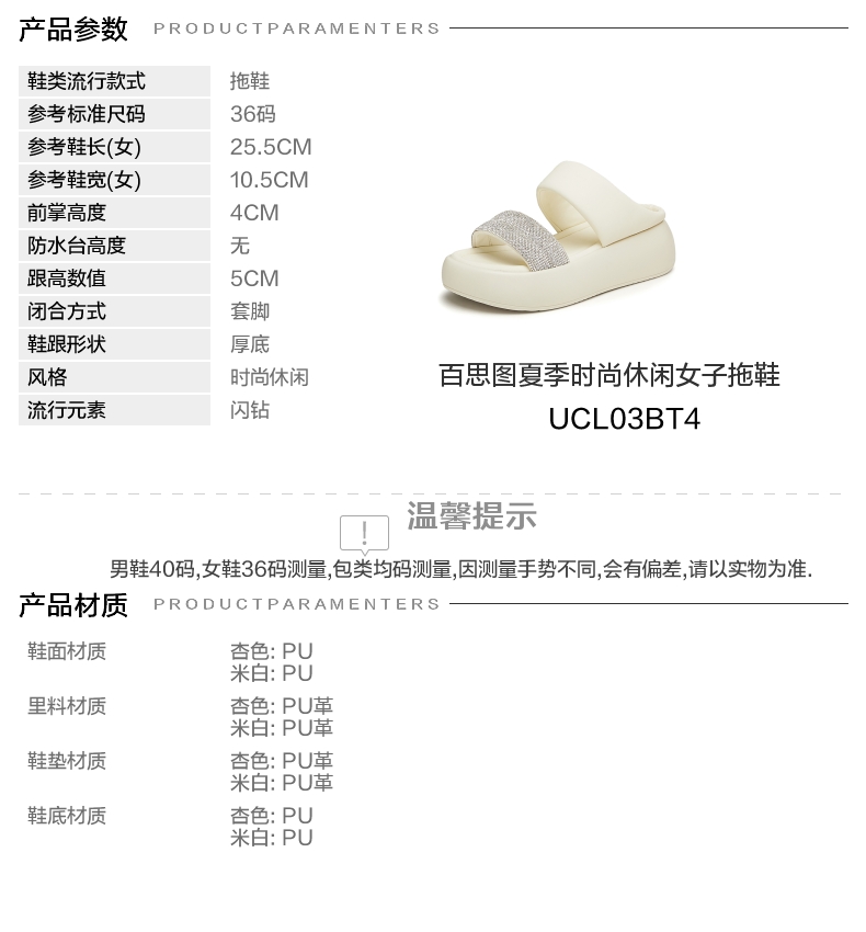 | 鞋类流行款式:拖鞋 | 鞋头款式:露趾 | 执行标准:拖鞋 QB/T 4552-2020 | 跟高范围:中跟鞋(3-5CM) | 鞋面图案:纯色 |