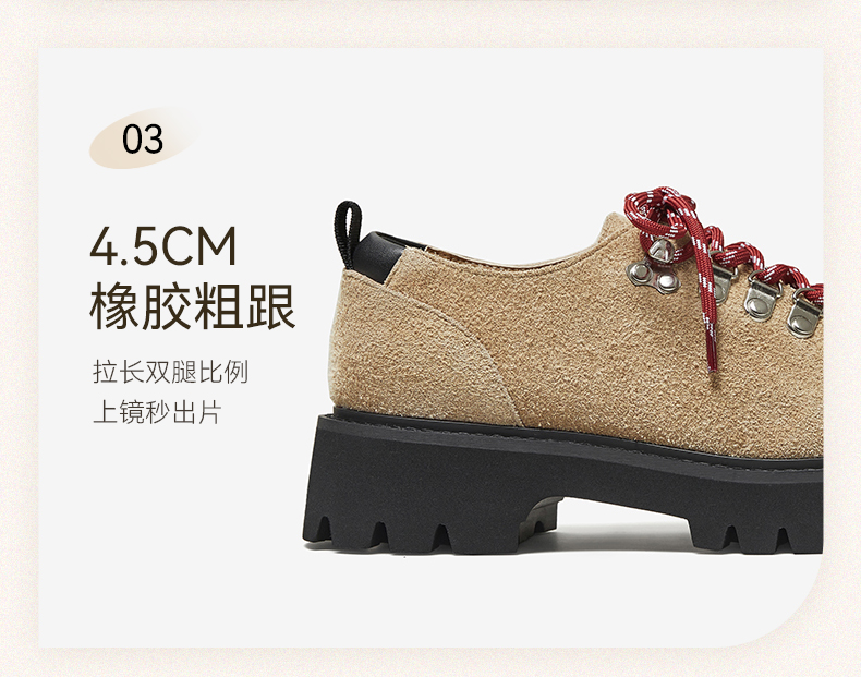 | 色系:杏色 | 跟高数值:4.5CM | 性别:女子 | 里料材质:PU革织物面料 | 制鞋工艺:胶贴皮鞋 |