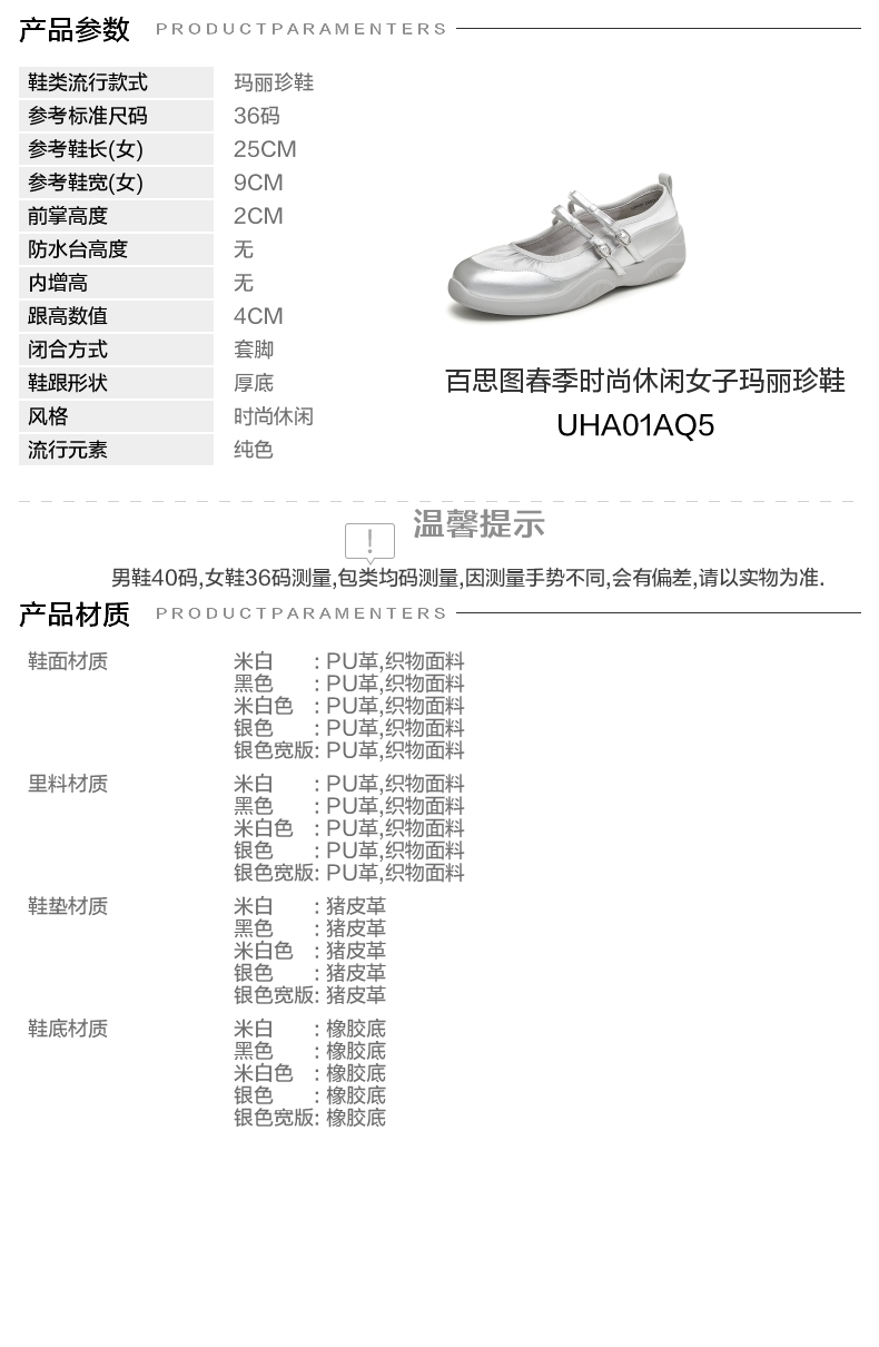 | 参考标准尺码:36码 | 跟高数值:4CM | 性别:女子 | 里料材质:织物面料PU革 | 制鞋工艺:胶贴皮鞋 |
