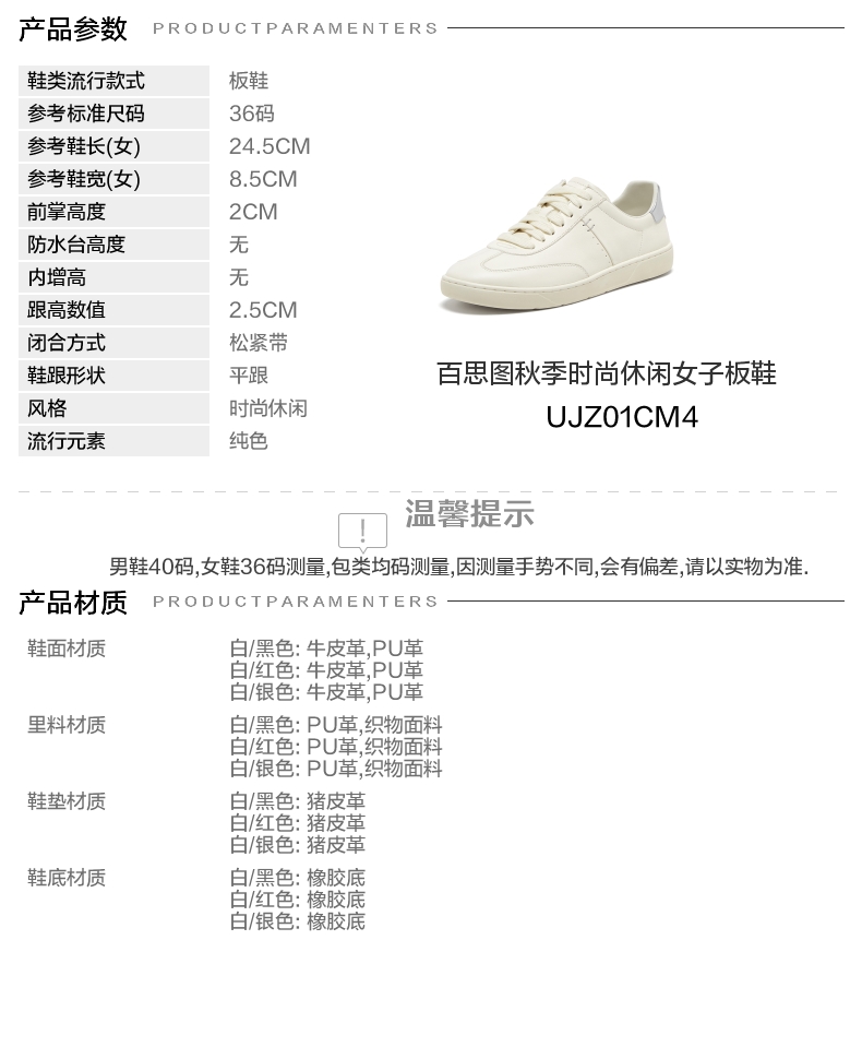 | 色系:白色 | 参考标准尺码:36码 | 跟高数值:2.5CM | 性别:女子 | 里料材质:织物面料PU革 |
