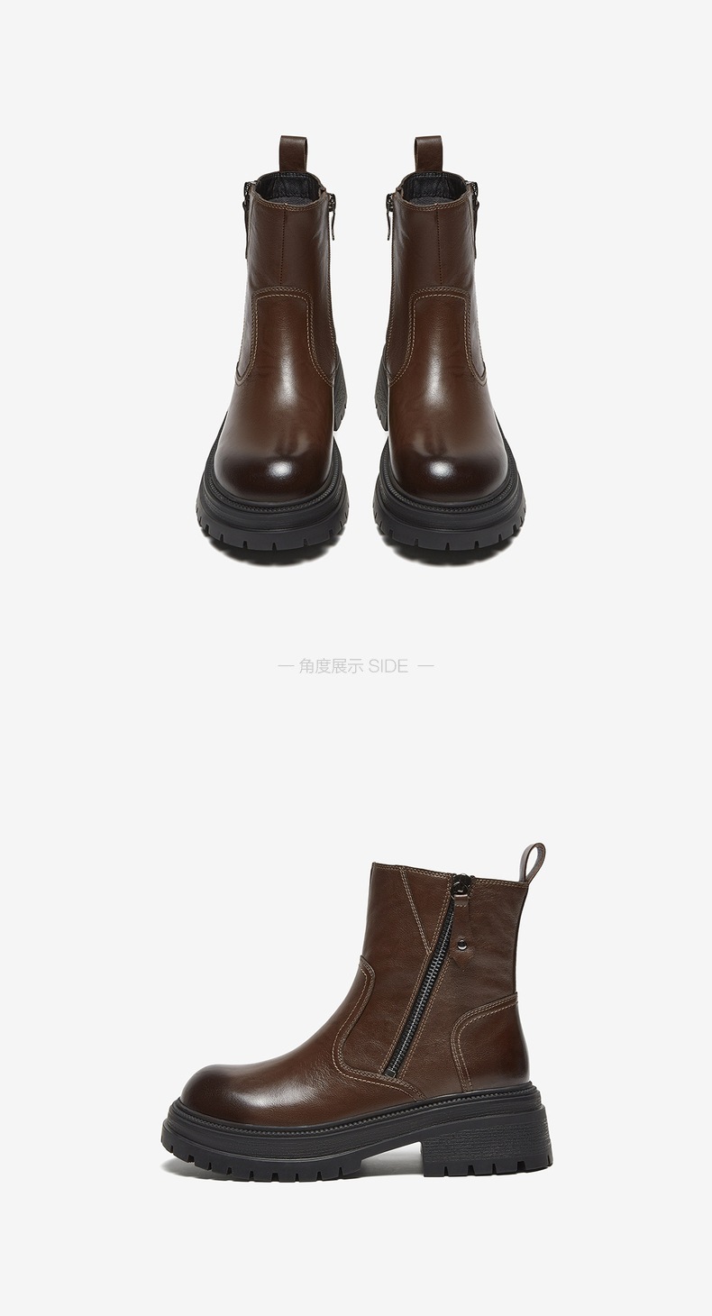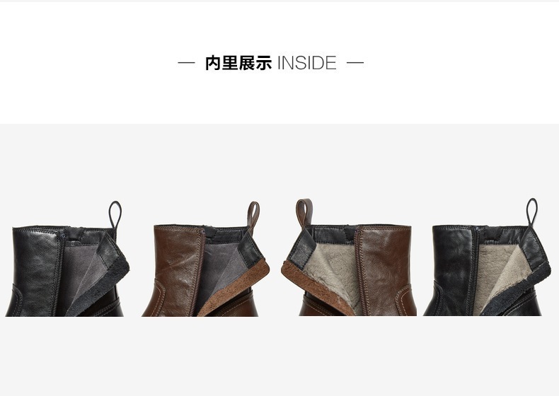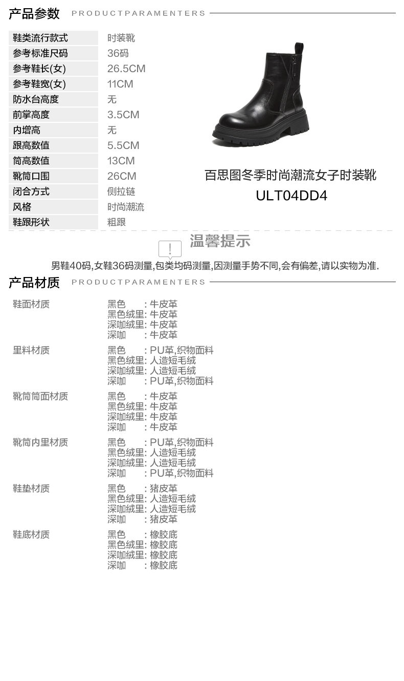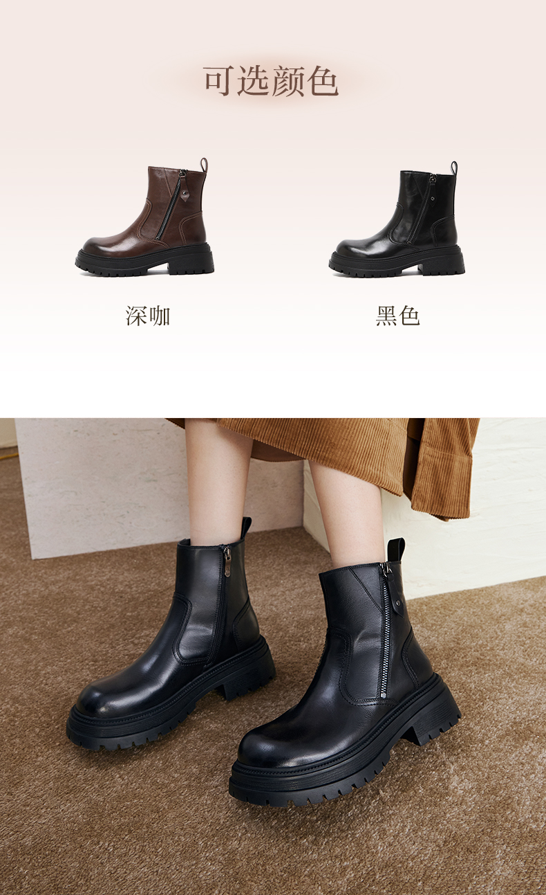 | 鞋底材质:橡胶底 | 靴筒内里材质:人造短毛绒 | 内增高:无 | 鞋面材质:牛皮革 | 闭合方式:侧拉链 |