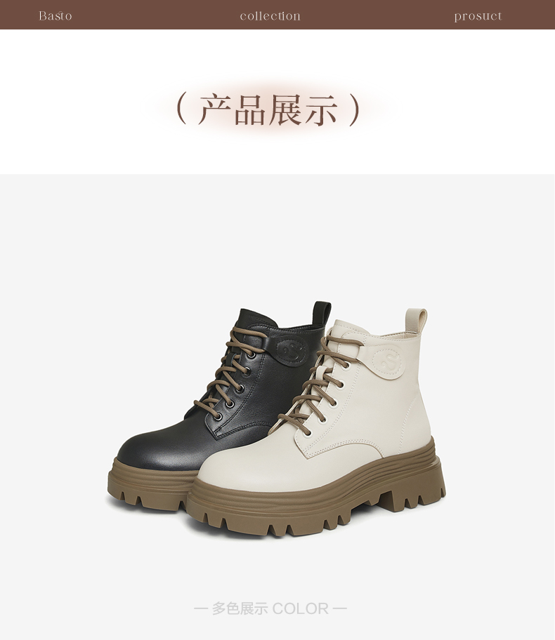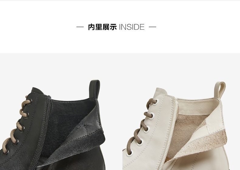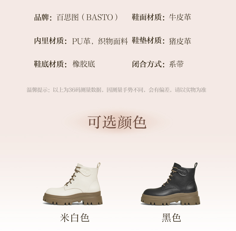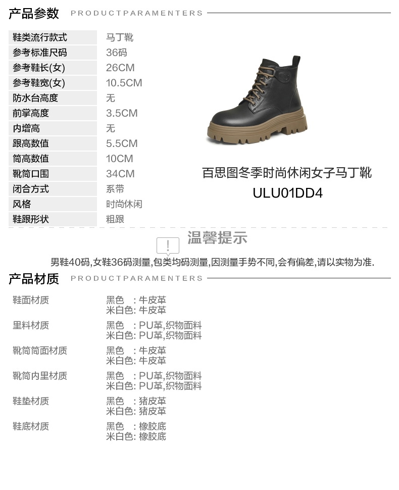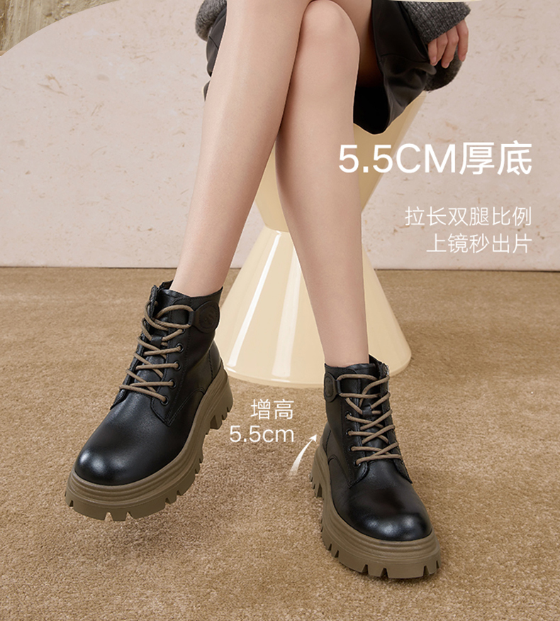 | 鞋类流行款式:马丁靴 | 鞋头款式:圆头 | 执行标准:舒适上班鞋Q/LR001-2023 | 跟高范围:中跟鞋(3-5CM) | 鞋面图案:纯色 |