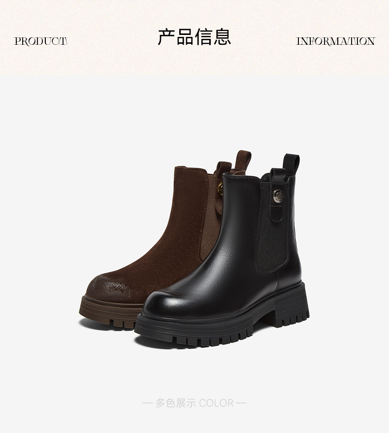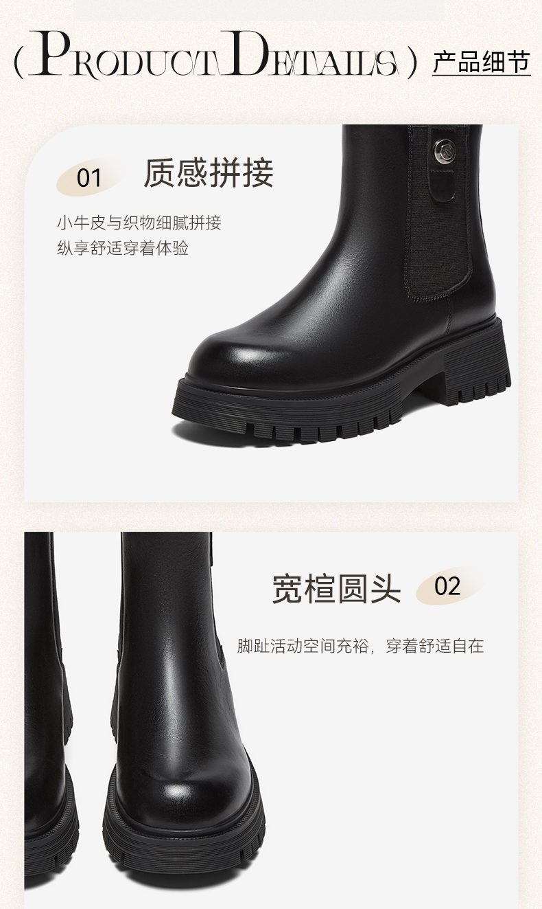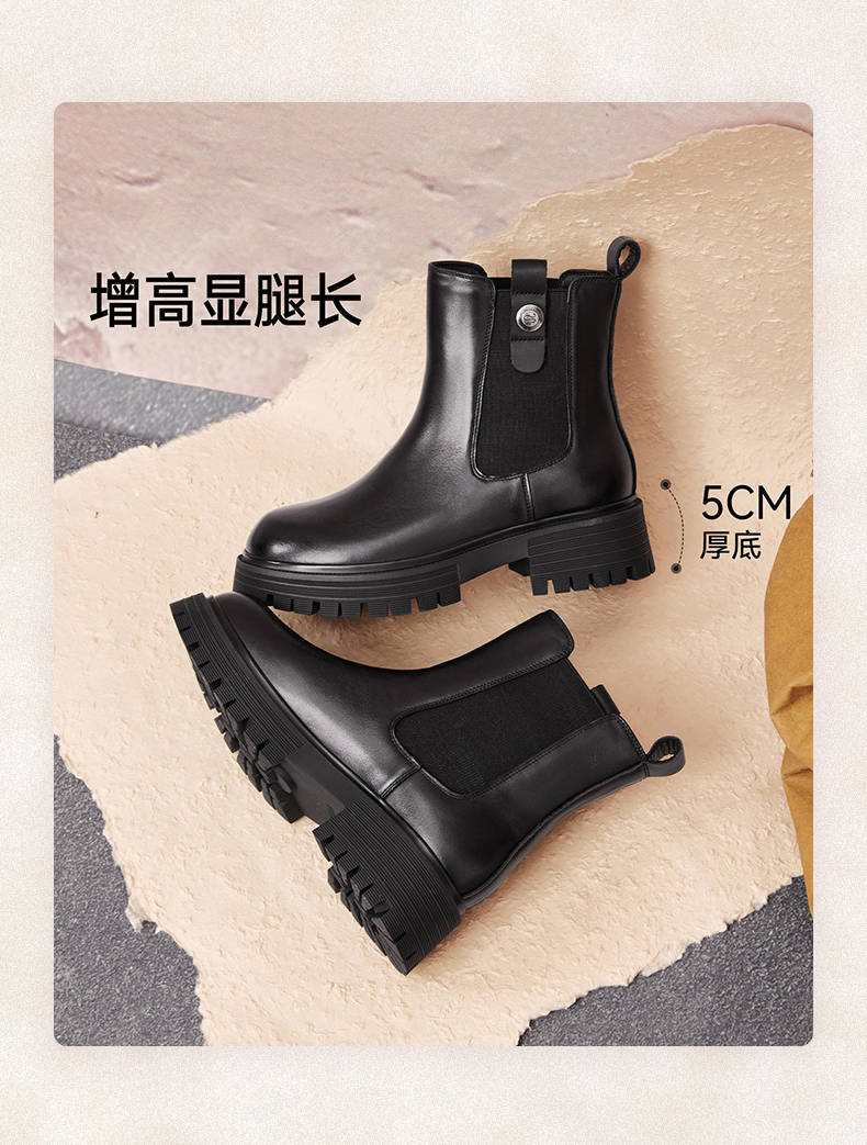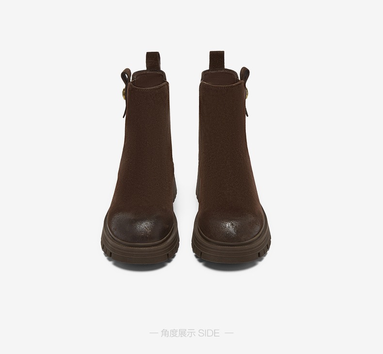| 帮面材质:织物牛剖层革 | 配跟:无 | 靴筒口围:28CM | 上市时间:2025年冬季 | 鞋类流行款式:切尔西靴 |