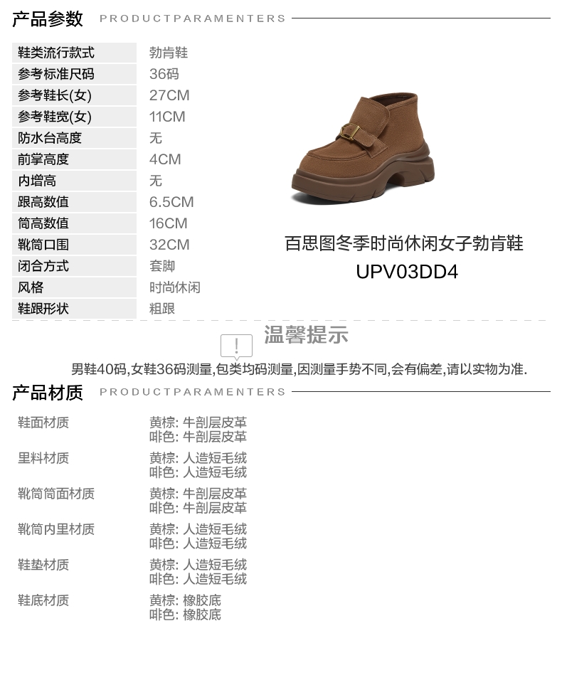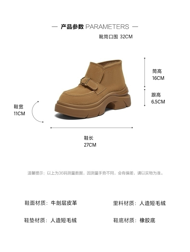 | 筒高数值:16CM | 性别:女子 | 靴筒筒面材质:牛剖层皮革 | 里料材质:人造短毛绒 | 制鞋工艺:胶贴皮鞋 |