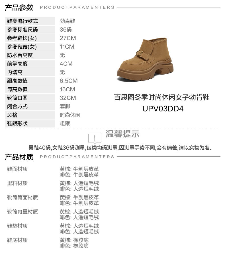 | 筒高数值:16CM | 性别:女子 | 靴筒筒面材质:牛剖层皮革 | 里料材质:人造短毛绒 | 制鞋工艺:胶贴皮鞋 |