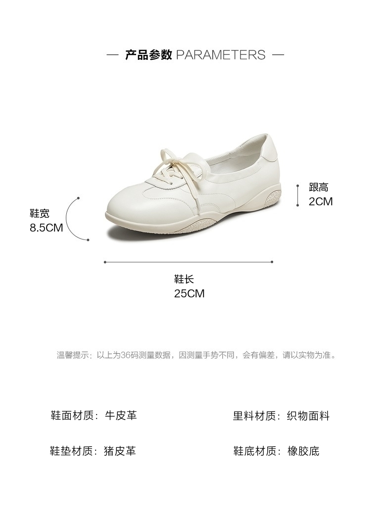 | 鞋帮:低帮 | 鞋底材质:橡胶底 | 内增高:无 | 鞋面材质:牛皮革 | 闭合方式:系带 |