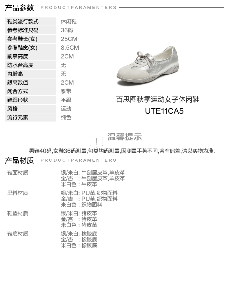 | 色系:银色 | 跟高数值:2CM | 性别:女子 | 里料材质:织物面料PU革 | 制鞋工艺:胶贴皮鞋 |