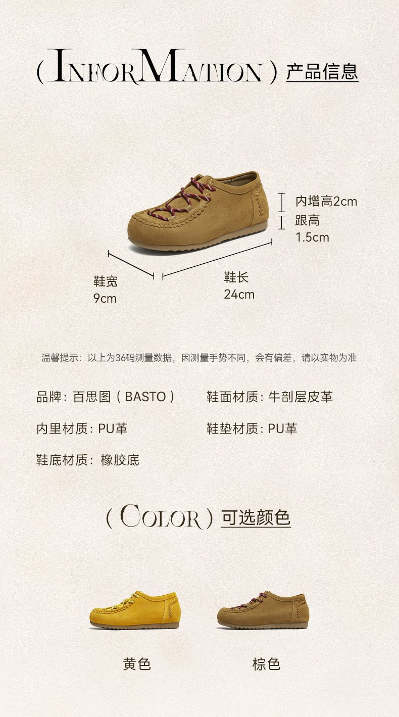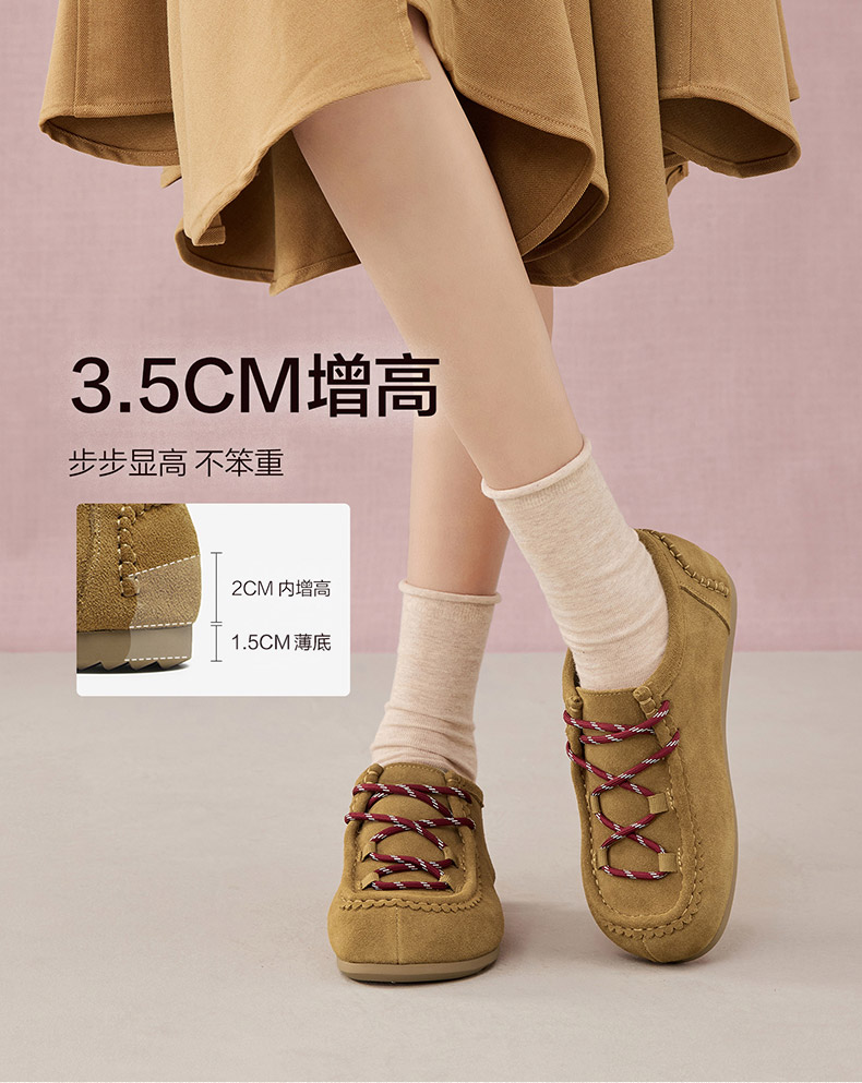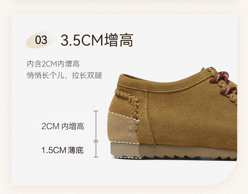| 鞋帮:低帮 | 鞋底材质:橡胶底 | 内增高:2CM | 鞋面材质:牛剖层皮革 | 闭合方式:系带 |
