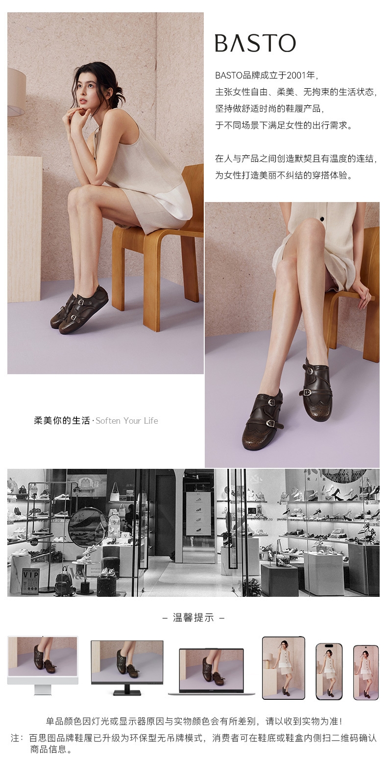 BASTO(百思图),品牌拥有17年历史,秉承优雅、甜美、清新的设计理念,主张“好嫁风”的产品风格,将甜美俏丽的少女情怀融合优雅气质的时尚品味,塑造出唯美优雅、受欢迎的女鞋款式。主打以女性温柔与亲和力为特色的流行时尚产品,糅合雅致又富有亲和力的裸粉色调,淑媛端庄、清新甜美。目前品牌已开设线下门店达1400多家。