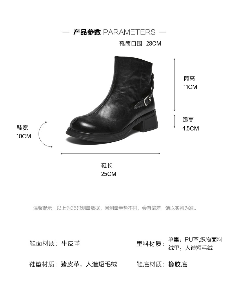 | 鞋底材质:橡胶底 | 靴筒内里材质:人造短毛绒 | 内增高:无 | 鞋面材质:牛皮革 | 闭合方式:后拉链 |