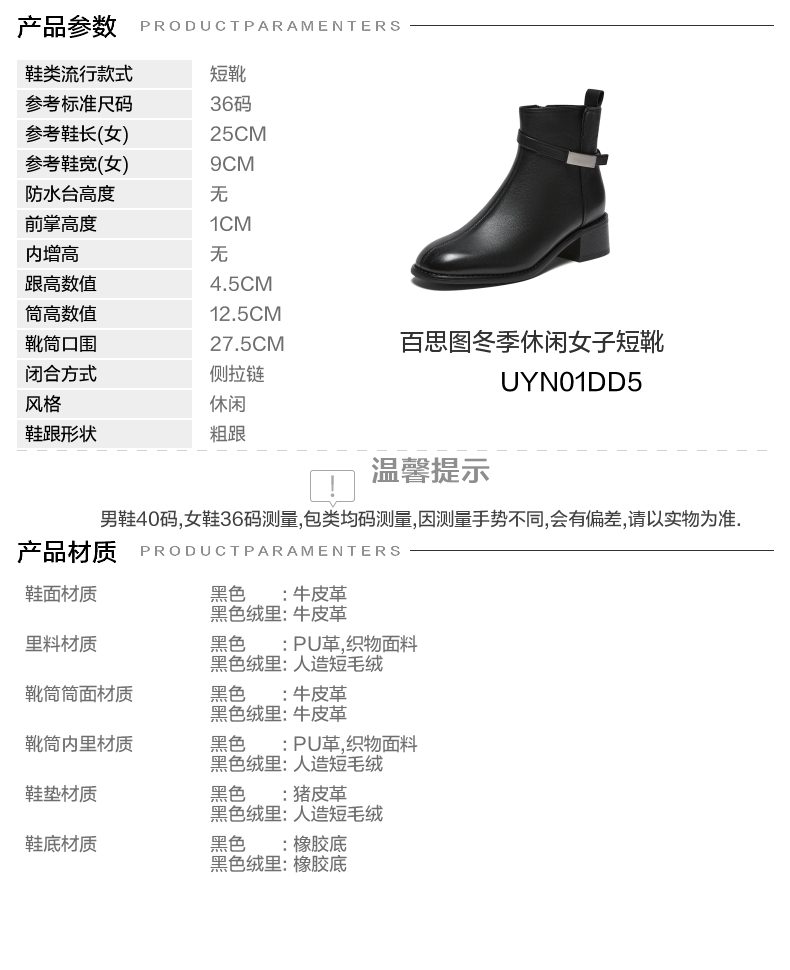 | 筒高数值:12.5CM | 性别:女子 | 靴筒筒面材质:牛皮革 | 里料材质:织物面料PU革 | 制鞋工艺:胶贴皮鞋 |