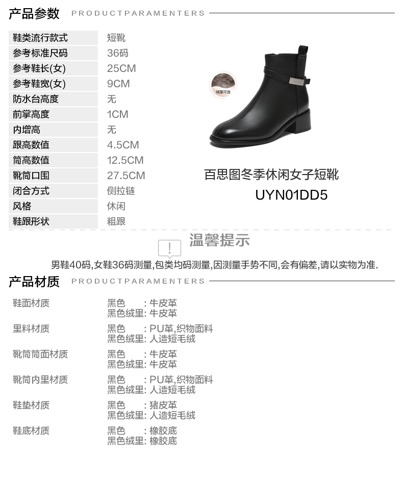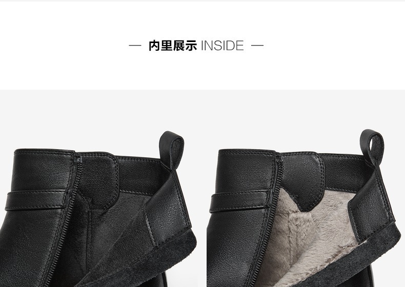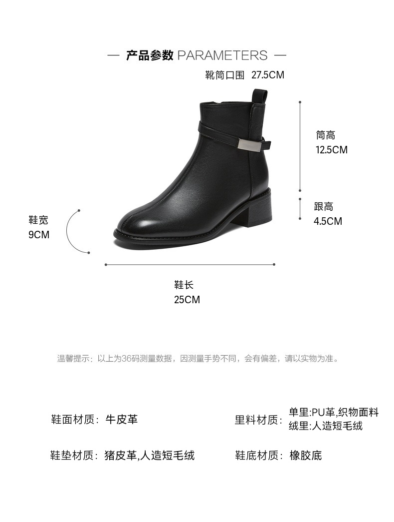 | 鞋底材质:橡胶底 | 靴筒内里材质:人造短毛绒 | 内增高:无 | 鞋面材质:牛皮革 | 闭合方式:侧拉链 |