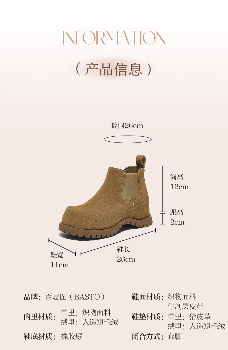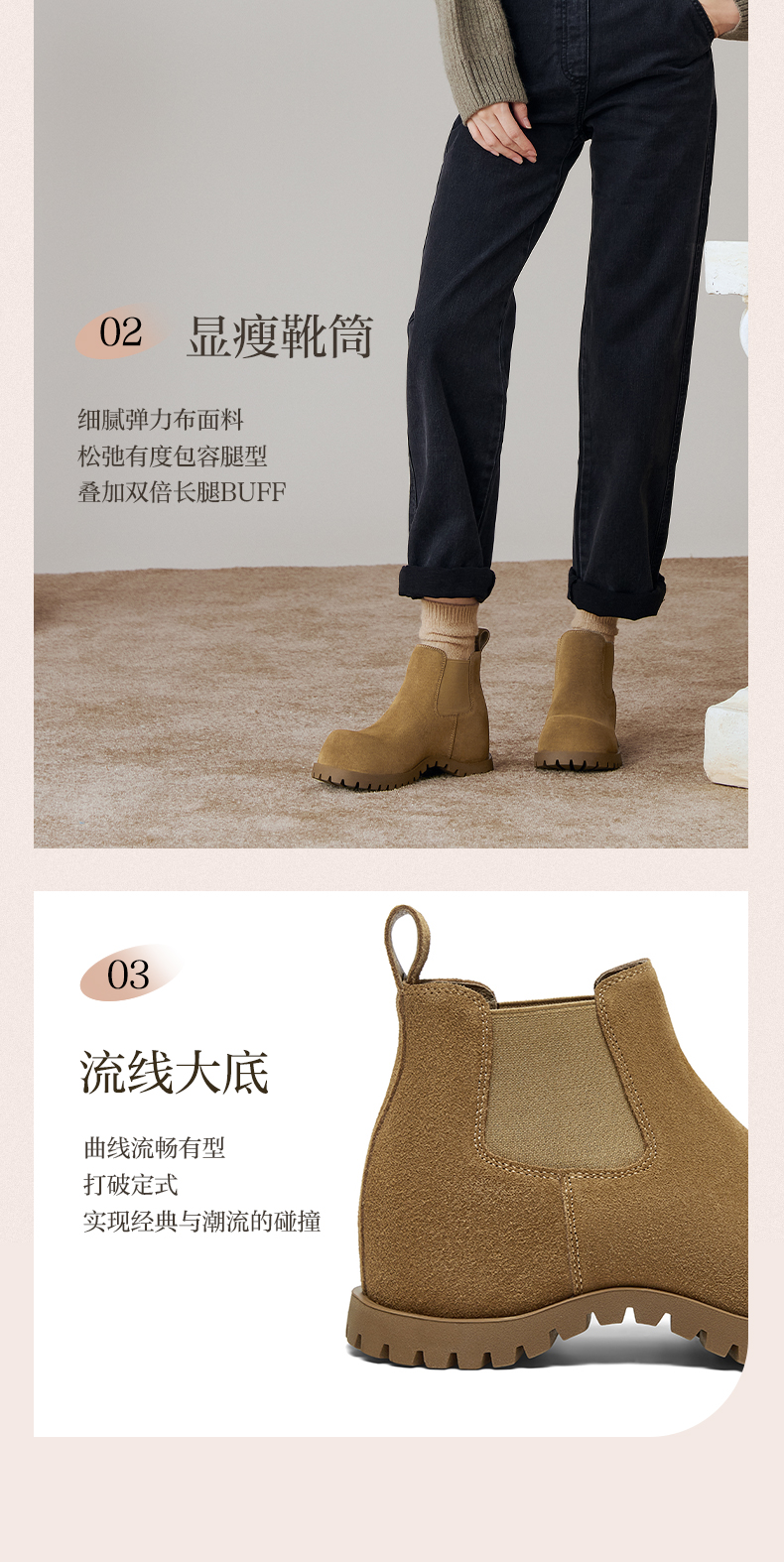 | 功能科技:耐磨 | 鞋底材质:橡胶底 | 靴筒内里材质:织物面料 | 内增高:4CM | 鞋面材质:织物面料牛剖层皮革 |