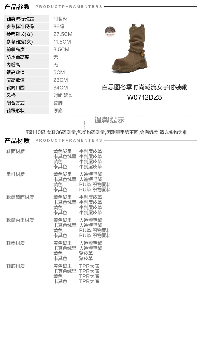 | 风格:时尚潮流 | 色系:卡其 | 跟高数值:5CM | 性别:女子 | 筒高数值:23CM |