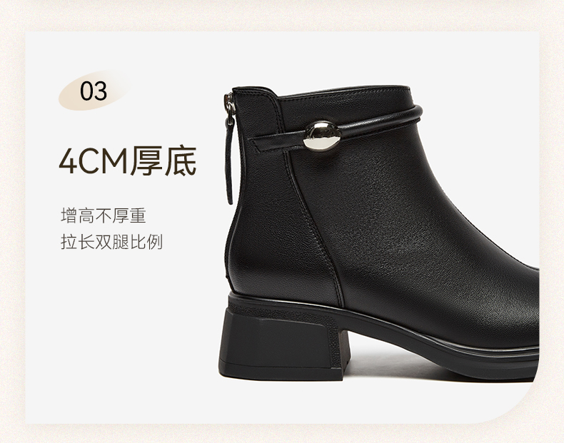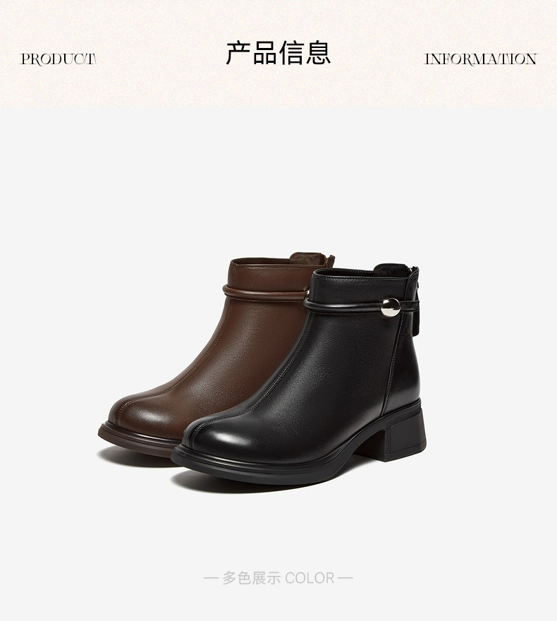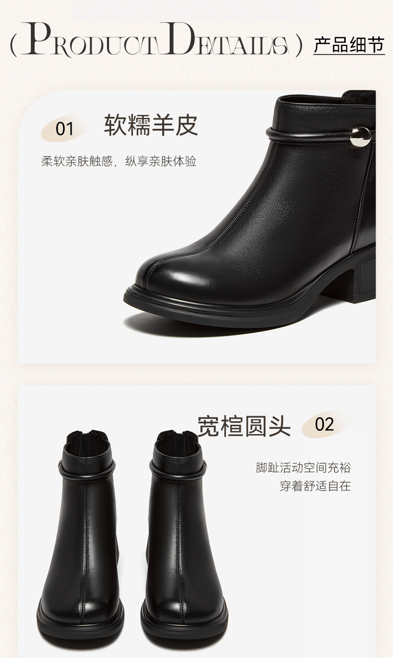 | 鞋底材质:橡胶底 | 靴筒内里材质:人造短毛绒 | 内增高:无 | 鞋面材质:羊皮革 | 闭合方式:后拉链 |