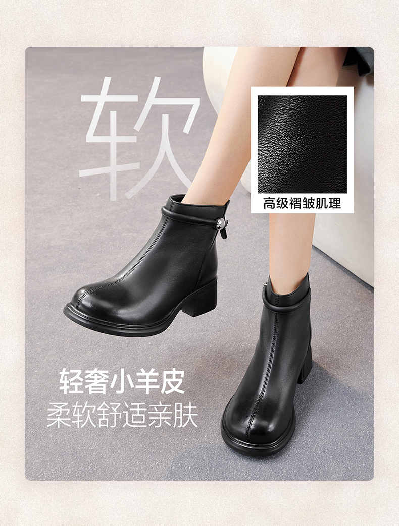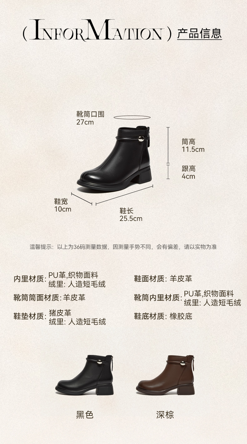 | 鞋底材质:橡胶底 | 靴筒内里材质:织物面料PU革 | 内增高:无 | 鞋面材质:羊皮革 | 闭合方式:后拉链 |