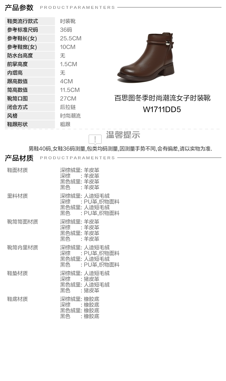 | 参考鞋宽(女):10CM | 风格:时尚潮流 | 色系:棕色 | 跟高数值:4CM | 筒高数值:11.5CM |