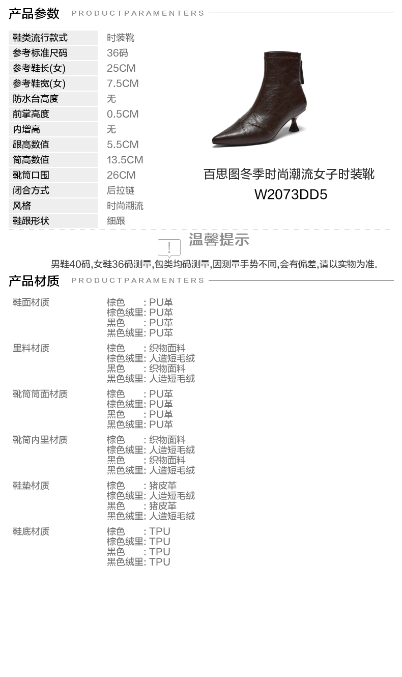 | 鞋垫材质:猪皮革 | 款式季节:冬季 | 前掌高度:0.5CM | 皮质特征:无 | 防水台高度:无 |