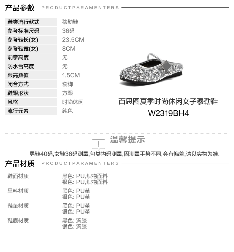 | 风格:时尚休闲 | 年份:2024年 | 色系:银色 | 参考标准尺码:36码 | 跟高数值:1.5CM |