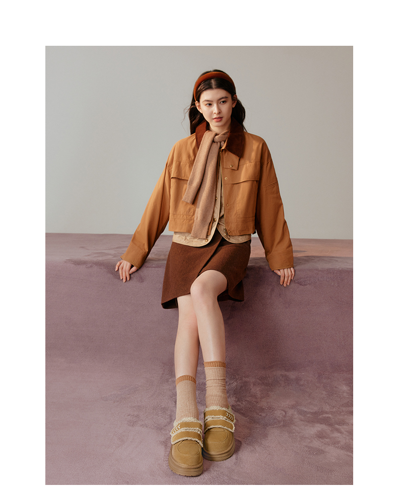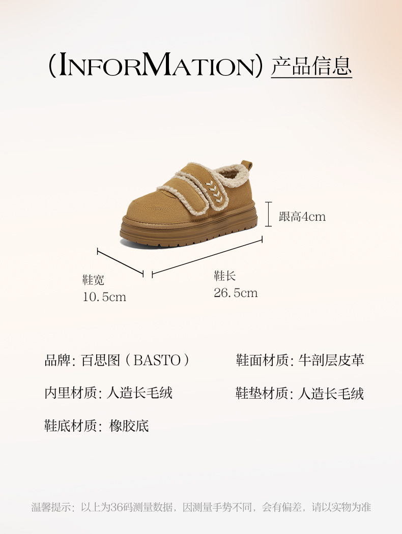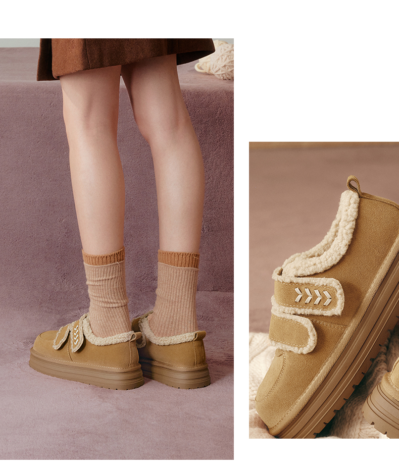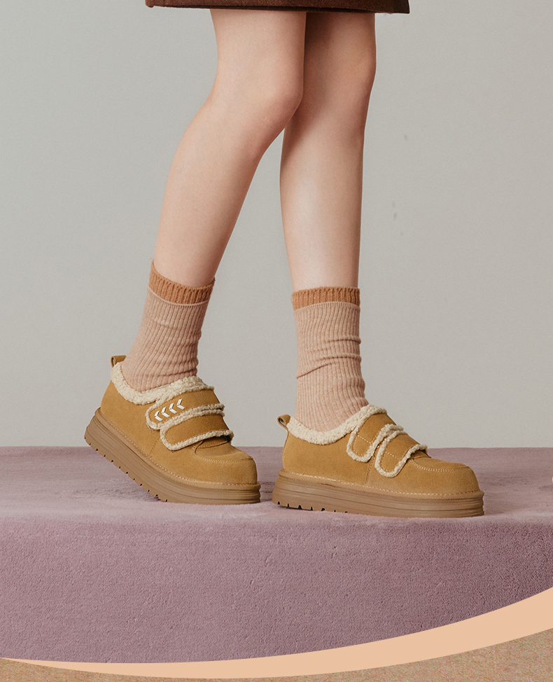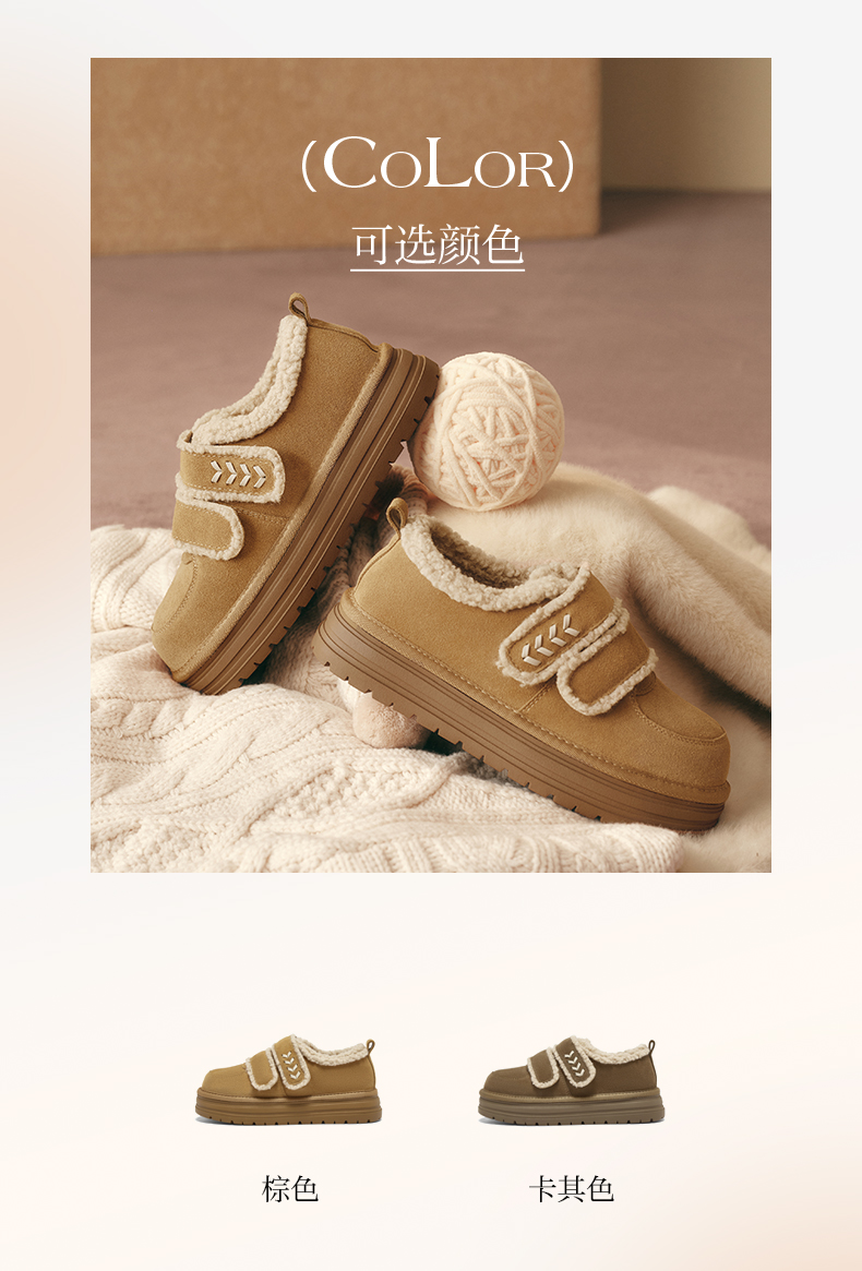| 色系:卡其 | 跟高数值:4CM | 性别:女子 | 里料材质:人造长毛绒 | 制鞋工艺:胶贴皮鞋 |