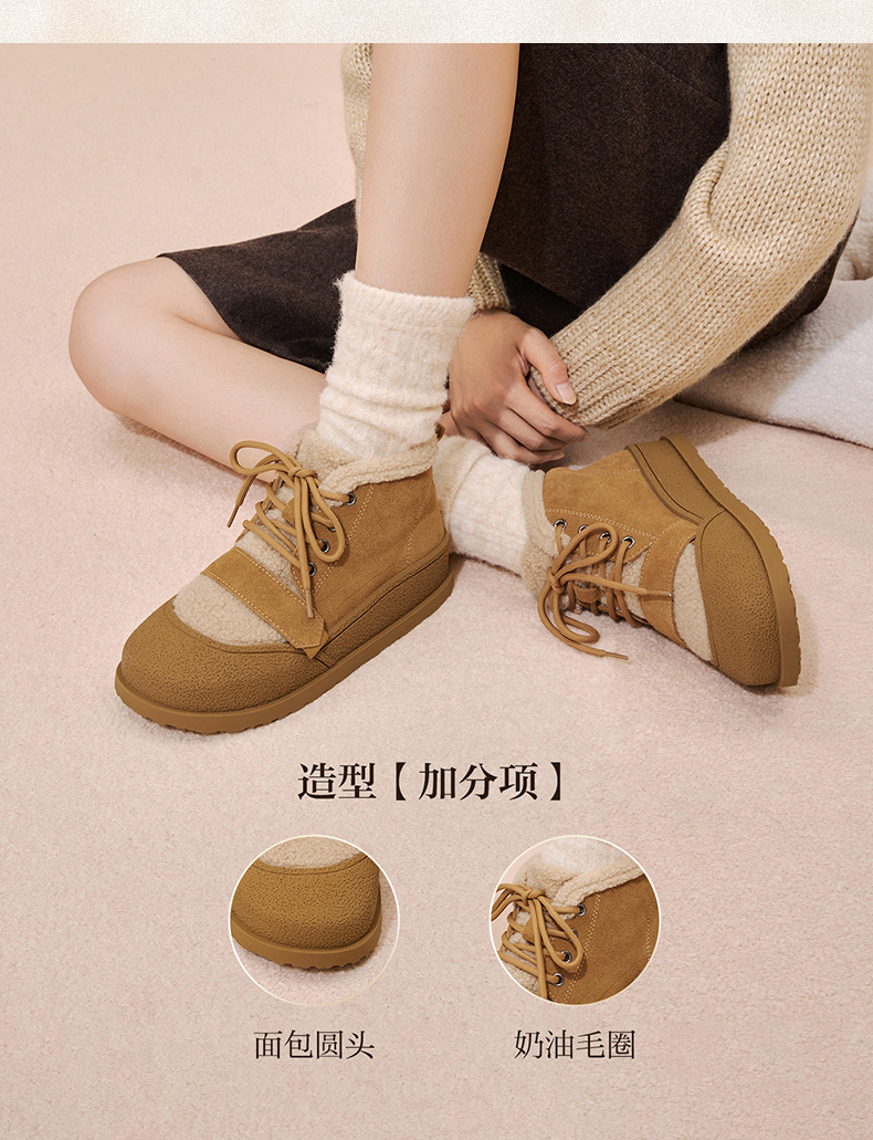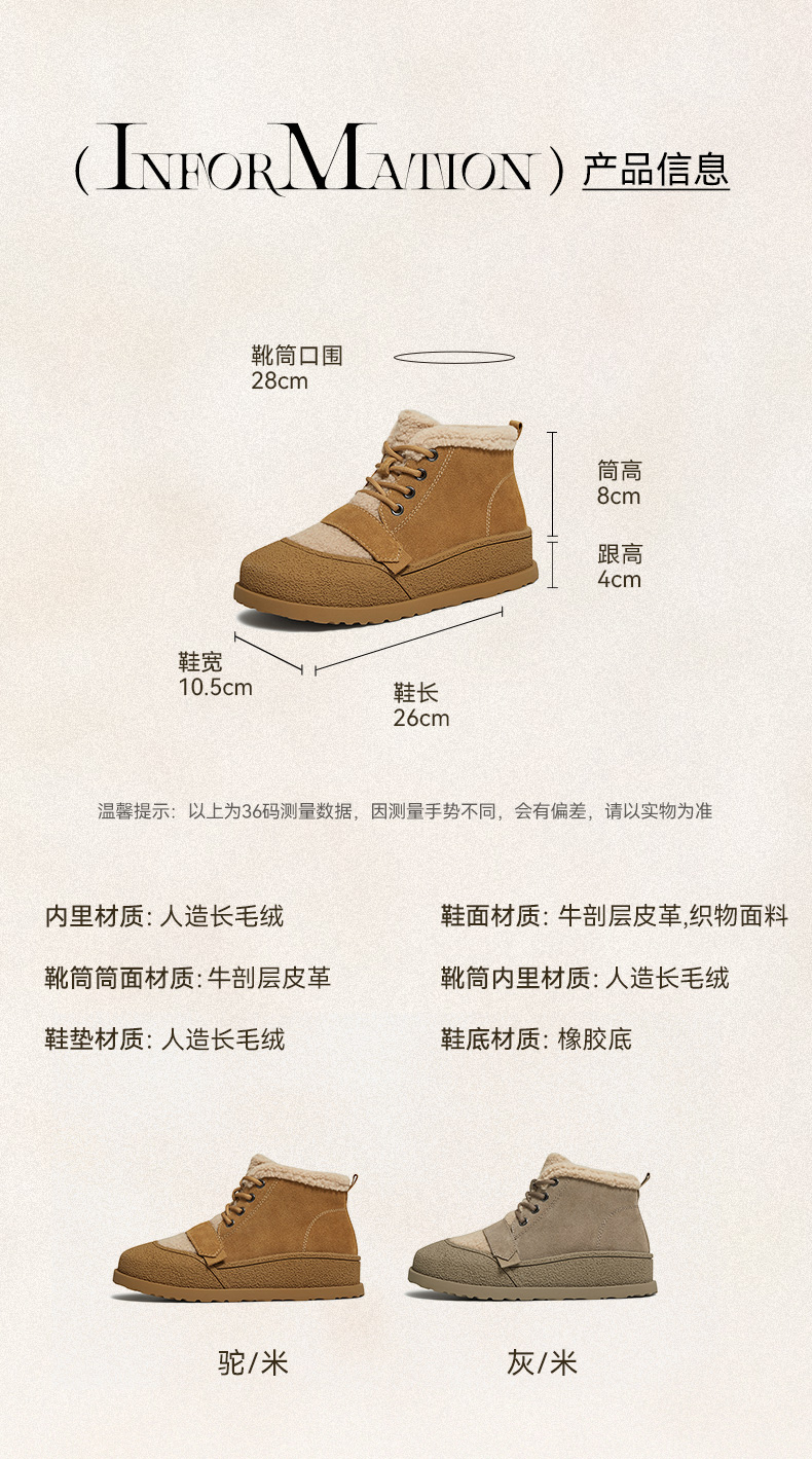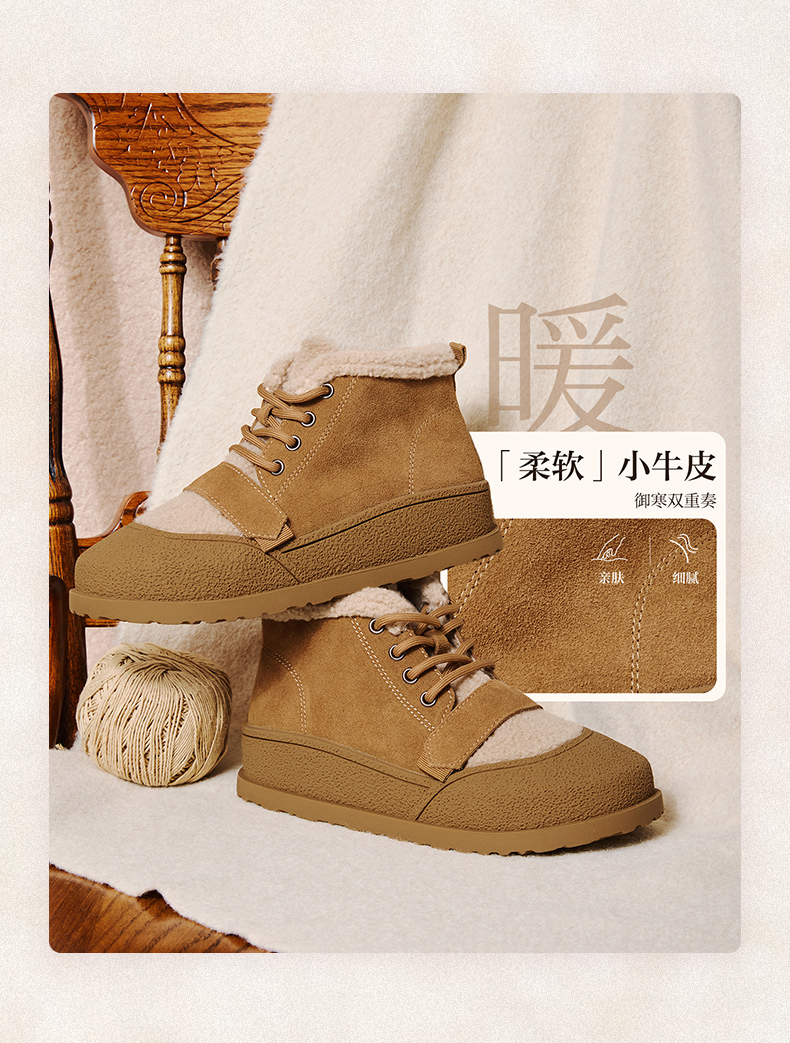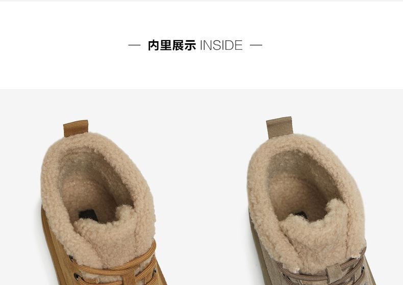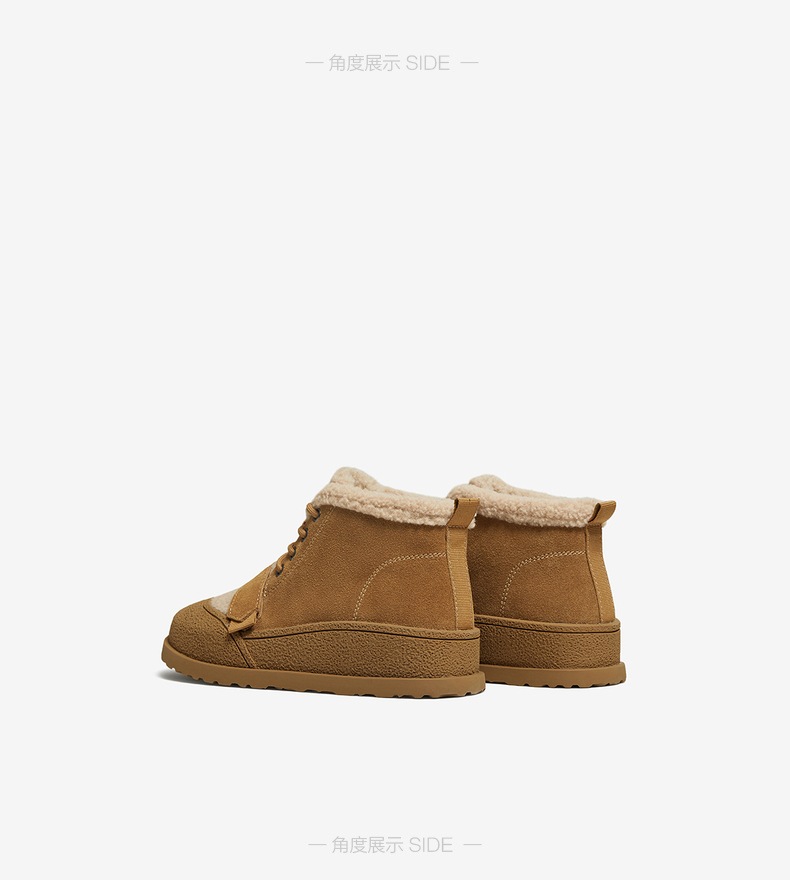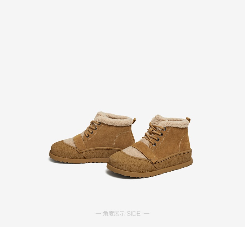 | 鞋底材质:橡胶底 | 靴筒内里材质:人造长毛绒 | 内增高:无 | 鞋面材质:织物面料牛剖层皮革 | 闭合方式:系带 |