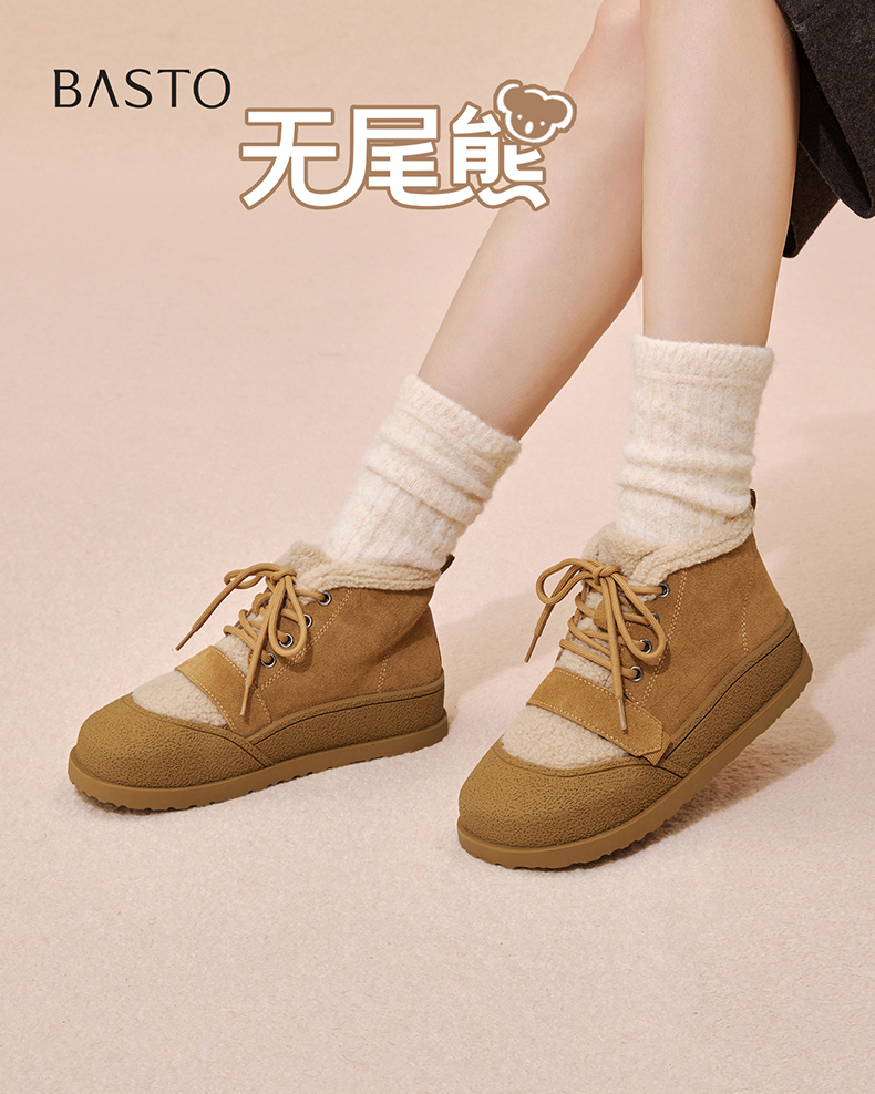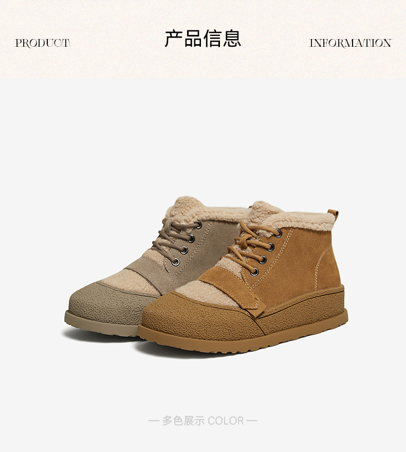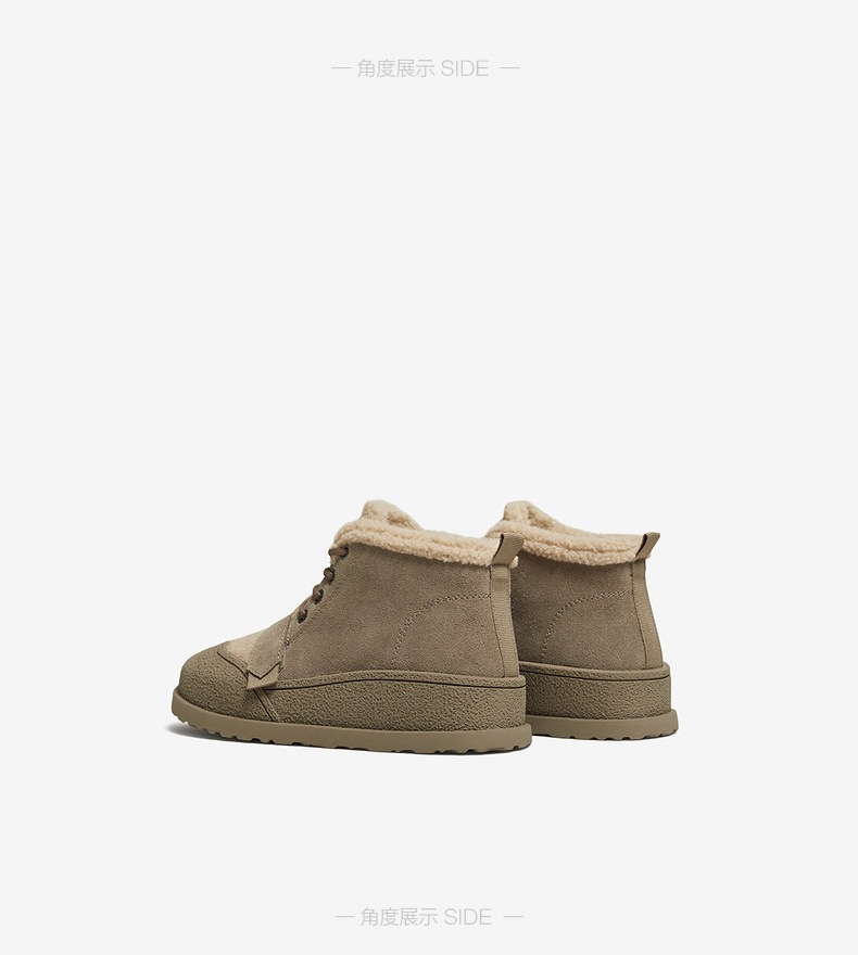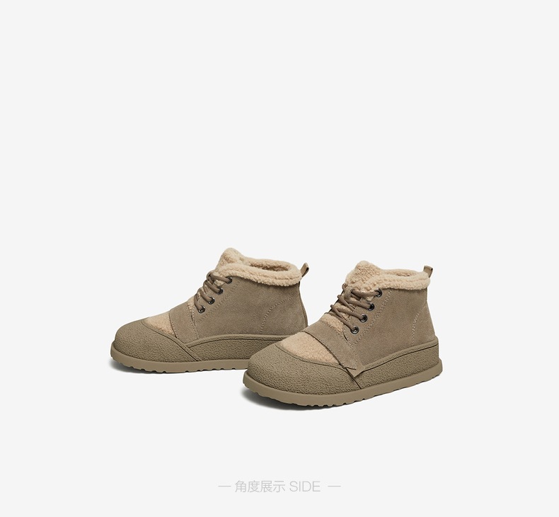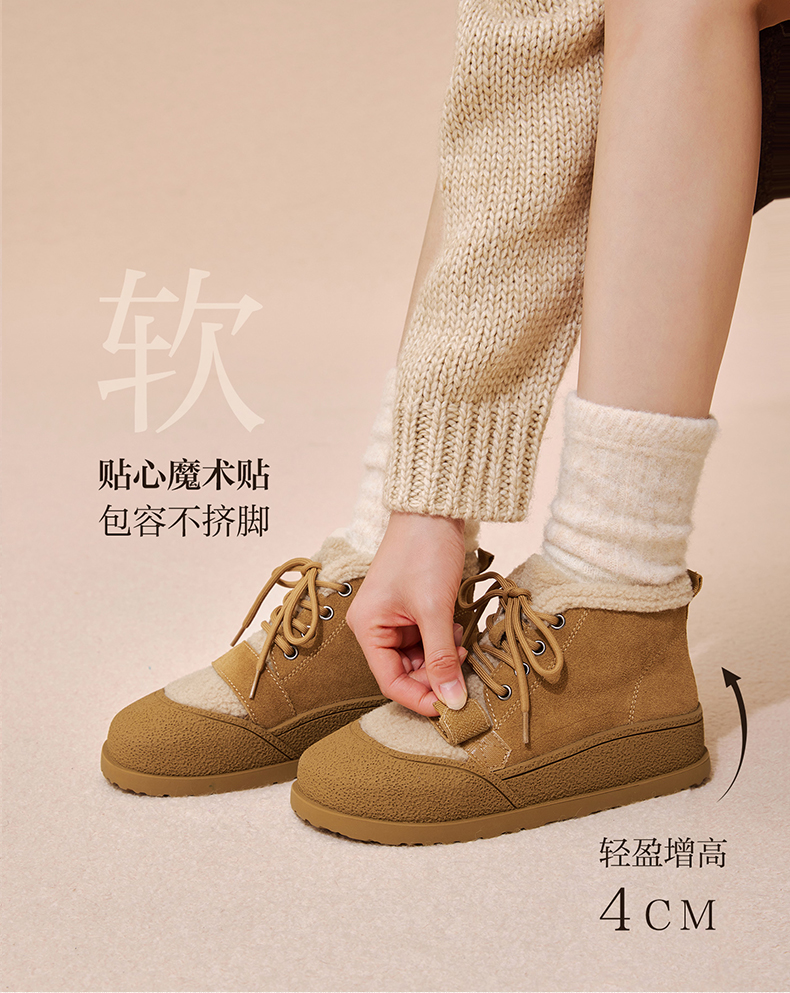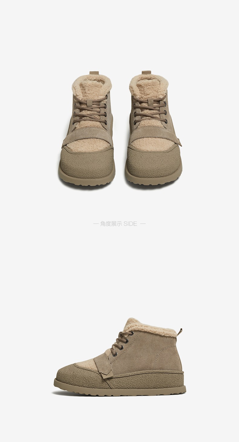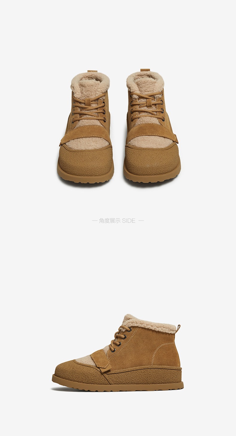 | 鞋底材质:橡胶底 | 靴筒内里材质:人造长毛绒 | 内增高:无 | 鞋面材质:织物面料牛剖层皮革 | 闭合方式:系带 |
