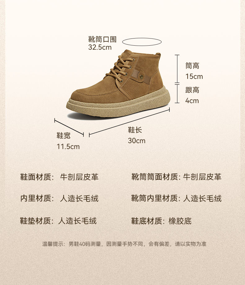 | 性别:男子 | 靴筒口围:32.5CM | 靴筒筒面材质:牛剖层皮革 | 里料材质:人造长毛绒 | 上市时间:2025年冬季 |