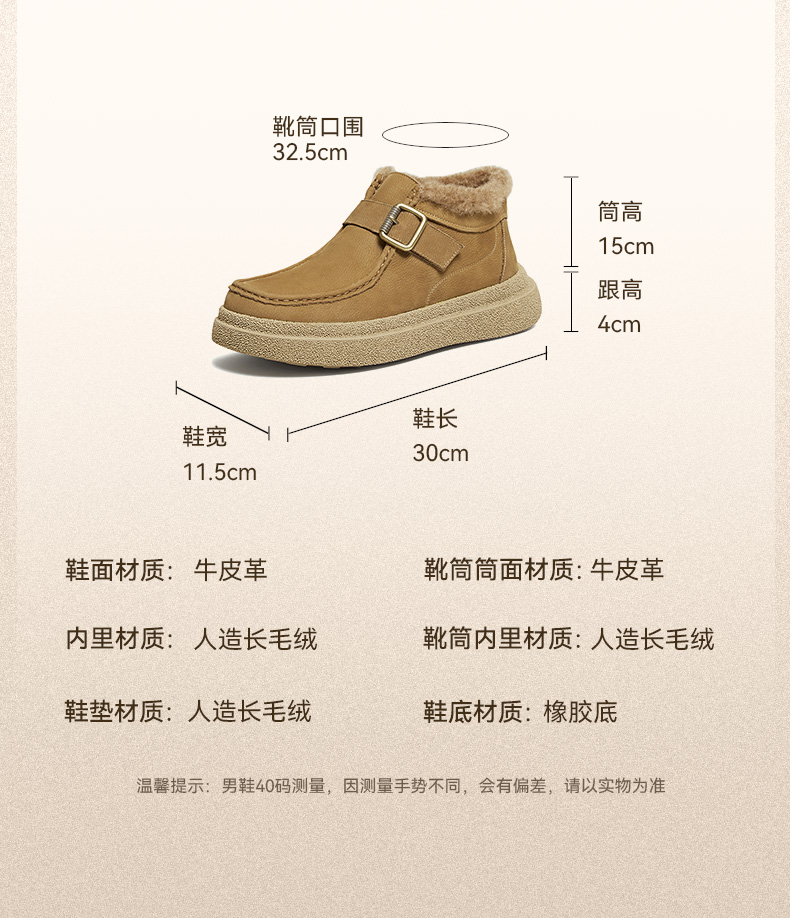 | 40码鞋长参考(男):30CM | 鞋底材质:橡胶底 | 靴筒内里材质:人造长毛绒 | 内增高:无 | 鞋面材质:牛皮革 |