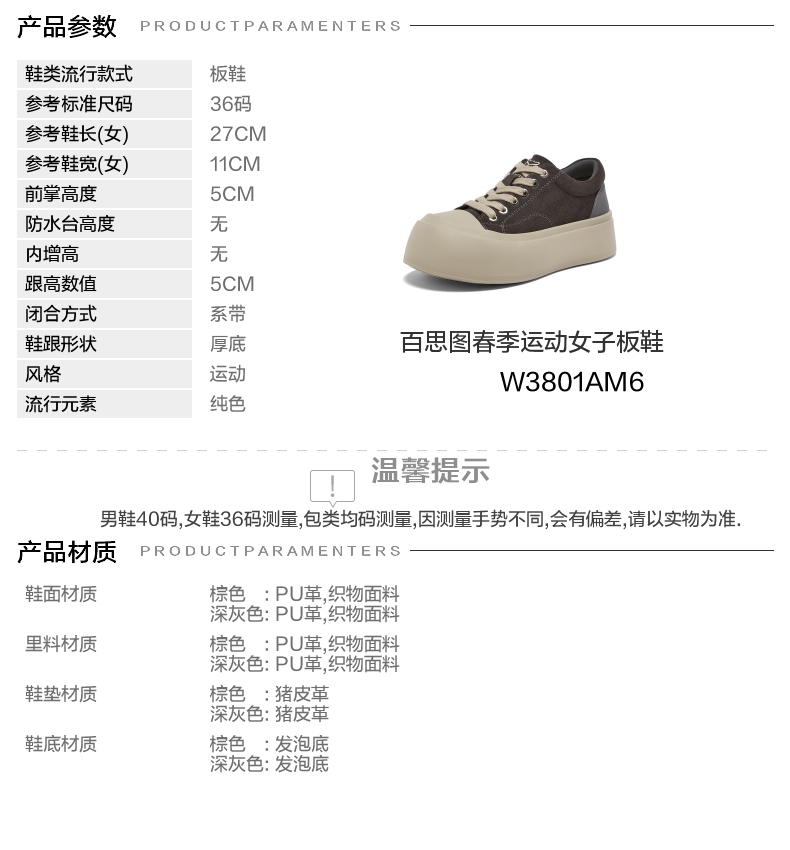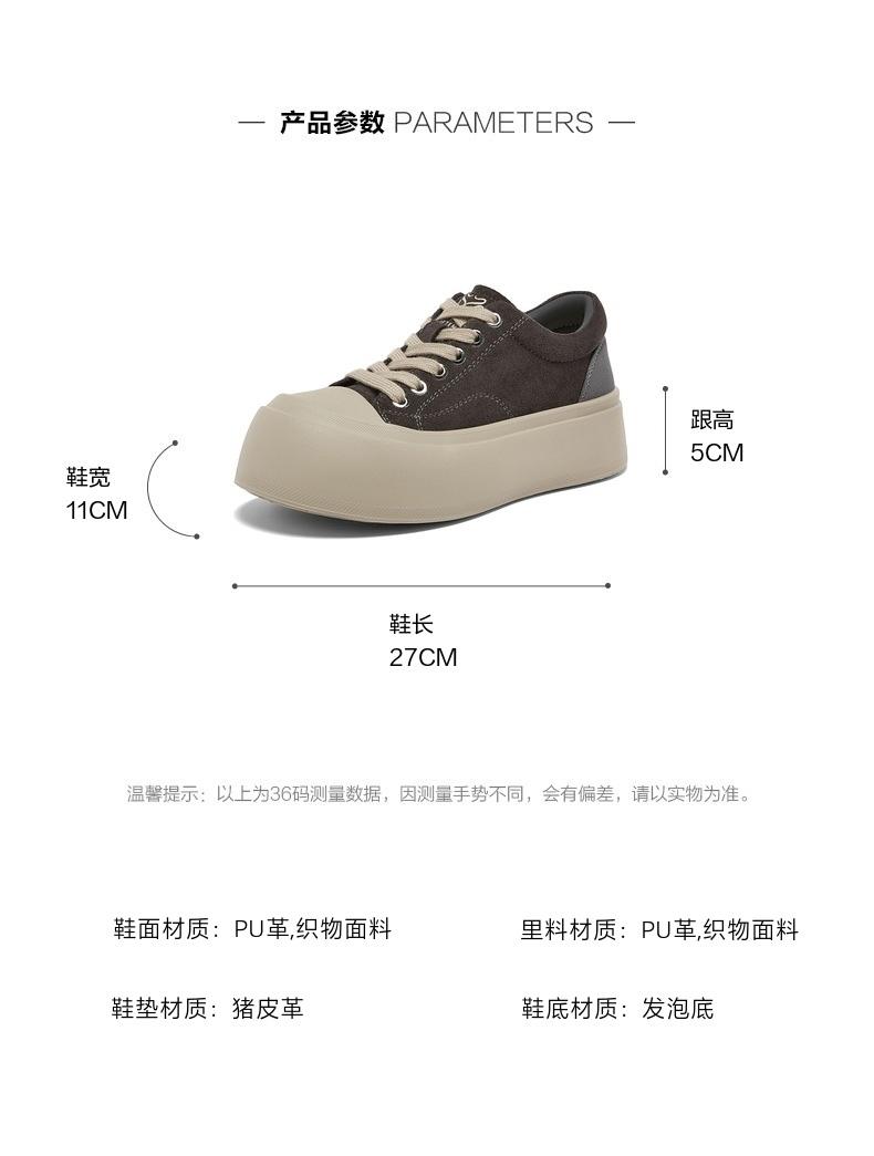 | 鞋帮:低帮 | 鞋底材质:发泡底 | 内增高:无 | 鞋面材质:织物面料PU革 | 闭合方式:系带 |