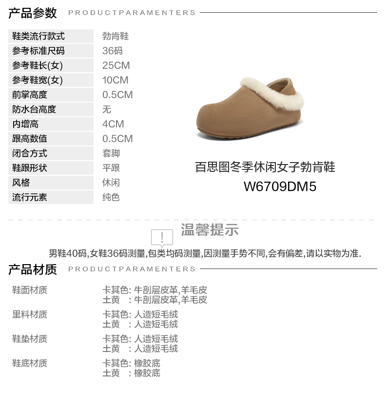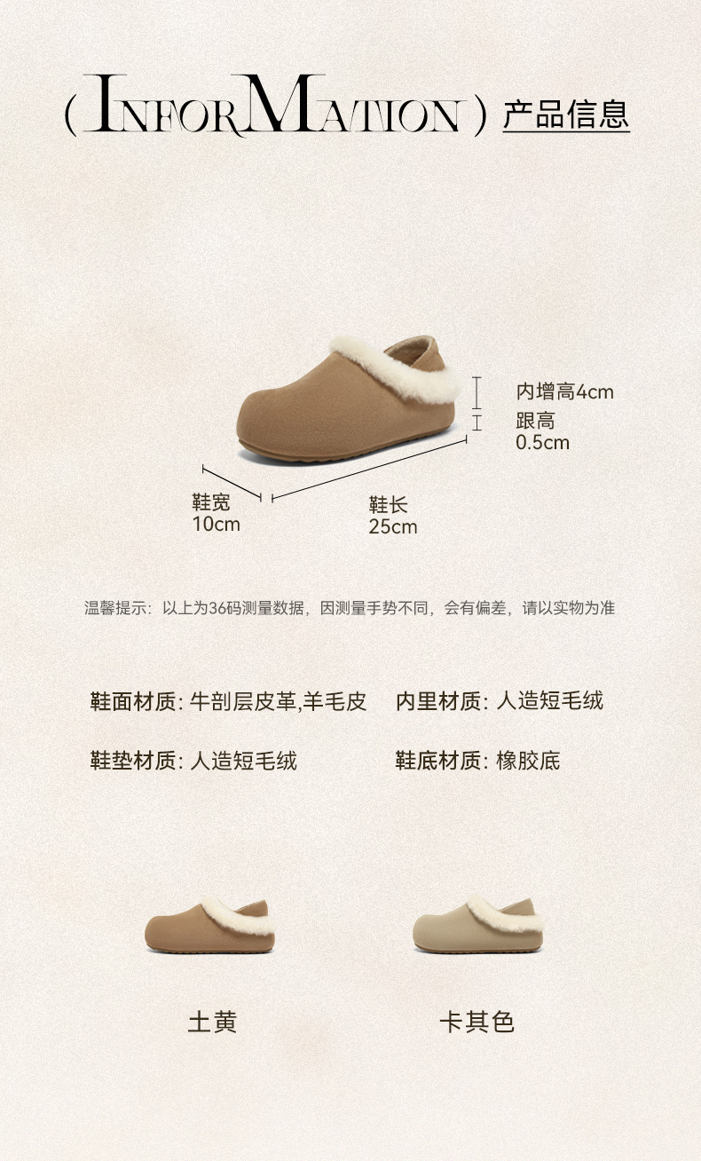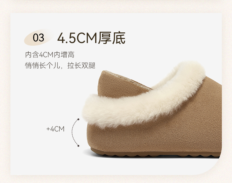 | 鞋帮:低帮 | 鞋底材质:橡胶底 | 内增高:4CM | 鞋面材质:羊毛皮牛剖层皮革 | 闭合方式:套脚 |