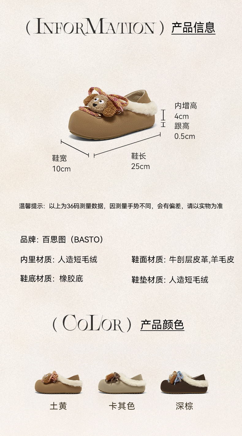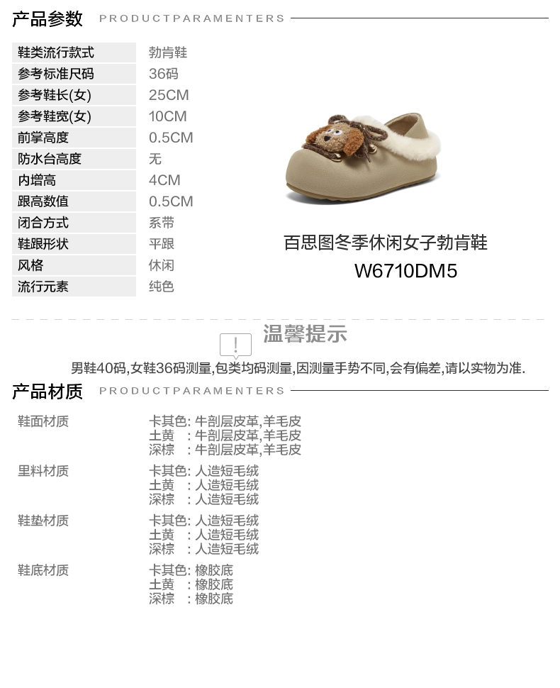 | 色系:卡其 | 跟高数值:0.5CM | 性别:女子 | 里料材质:人造短毛绒 | 制鞋工艺:胶贴皮鞋 |