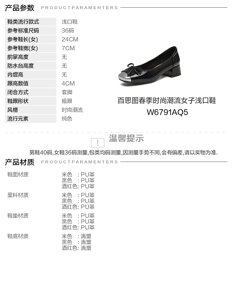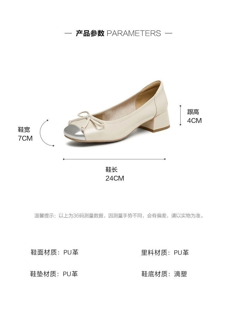 | 参考标准尺码:36码 | 跟高数值:4CM | 性别:女子 | 里料材质:PU革 | 制鞋工艺:胶贴皮鞋 |