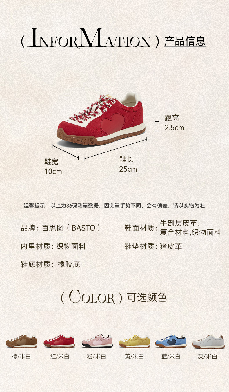 BASTO(百思图),品牌拥有17年历史,秉承优雅、甜美、清新的设计理念,主张“好嫁风”的产品风格,将甜美俏丽的少女情怀融合优雅气质的时尚品味,塑造出唯美优雅、受欢迎的女鞋款式。主打以女性温柔与亲和力为特色的流行时尚产品,糅合雅致又富有亲和力的裸粉色调,淑媛端庄、清新甜美。目前品牌已开设线下门店达1400多家。
