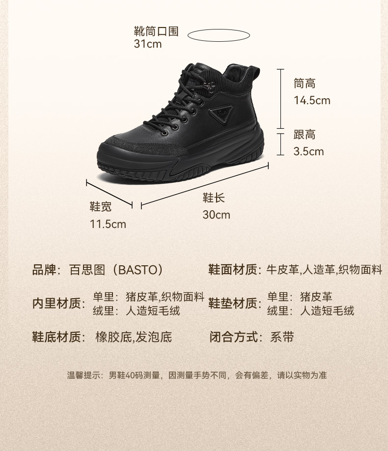 | 闭合方式:系带 | 40码鞋宽参考(男):11.5CM | 靴筒口围:31CM | 上市时间:2025年冬季 | 鞋类流行款式:低靴 |