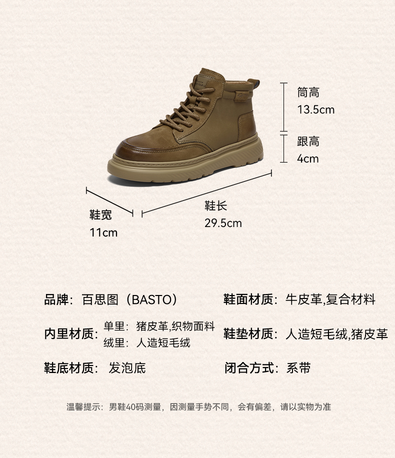 | 40码鞋长参考(男):29.5CM | 鞋底材质:发泡底 | 靴筒内里材质:猪皮革织物面料 | 内增高:无 | 鞋面材质:复合材料牛皮革 |