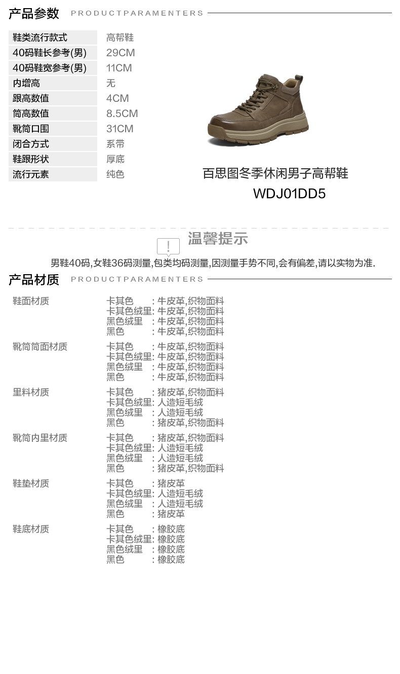 | 闭合方式:系带 | 40码鞋宽参考(男):11CM | 靴筒口围:31CM | 上市时间:2025年冬季 | 鞋类流行款式:高帮鞋 |