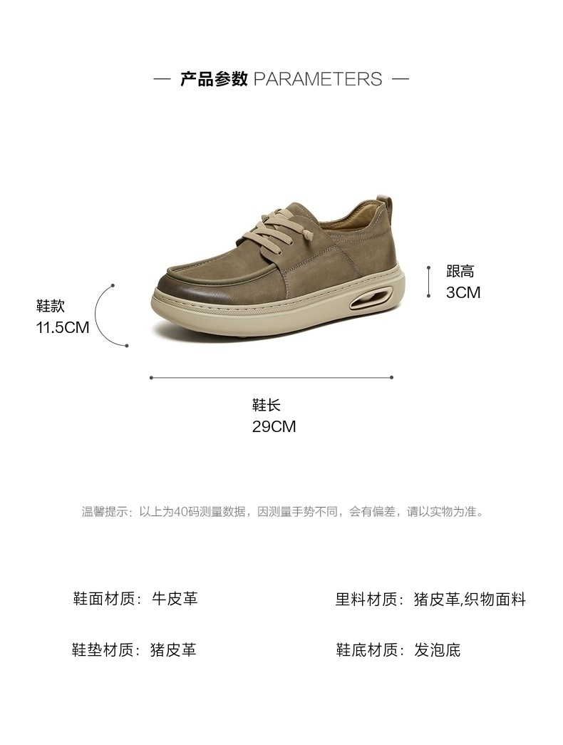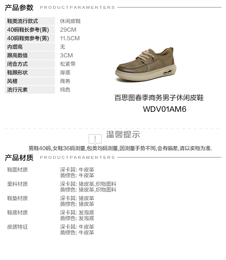 | 风格:商务 | 色系:卡其 | 跟高数值:3CM | 40码鞋宽参考(男):11.5CM | 性别:男子 |
