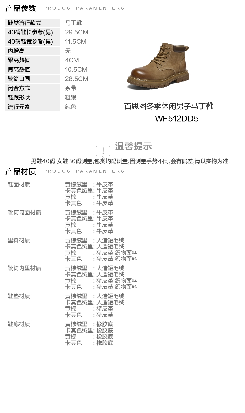 | 风格:休闲 | 色系:棕色 | 跟高数值:4CM | 40码鞋宽参考(男):11.5CM | 筒高数值:10.5CM |