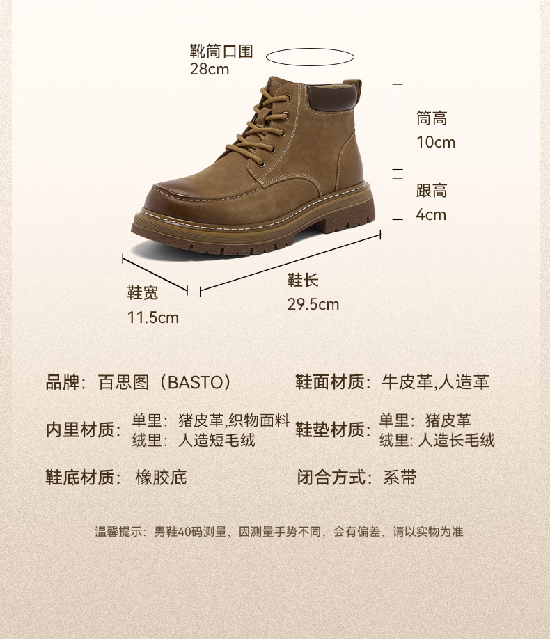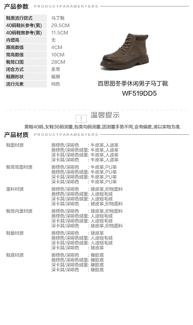 | 闭合方式:系带 | 40码鞋宽参考(男):11.5CM | 靴筒口围:28CM | 上市时间:2025年冬季 | 鞋类流行款式:马丁靴 |