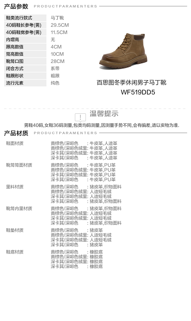 | 靴筒筒面材质:PU革牛皮革 | 里料材质:织物面料猪皮革 | 制鞋工艺:胶贴皮鞋 | 鞋垫材质:猪皮革 | 款式季节:冬季 |